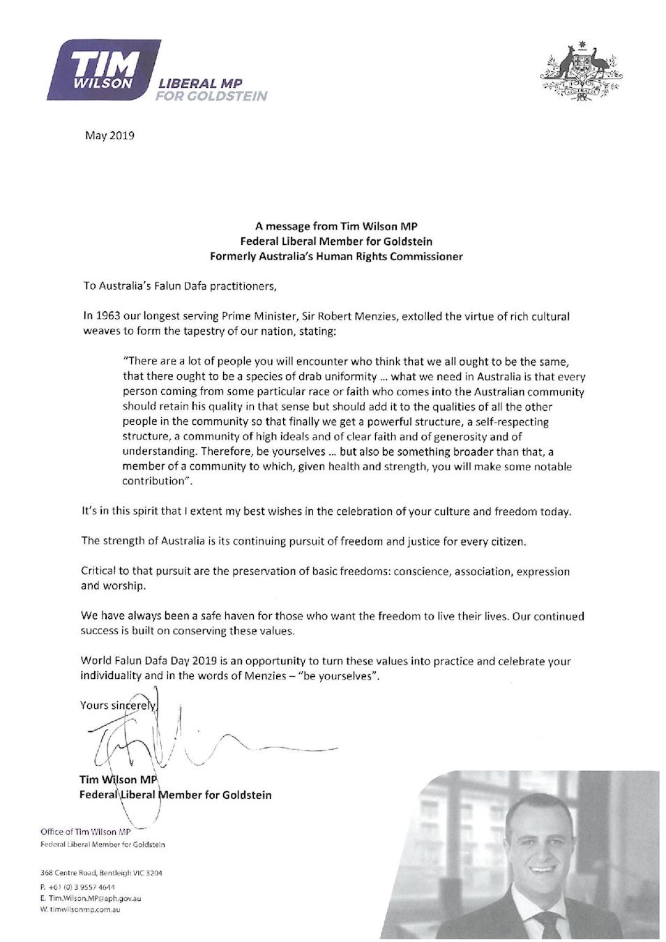 ![]() 图9:维州Goldstein选区自由党联邦议员、前澳洲人权事务专员威尔逊(Tim Wilson)发来贺信恭祝世界法轮大法日。 |