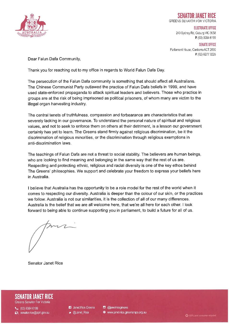 ![]() 图10:澳洲联邦参议员、维州绿党创始人莱斯(Janet Rice)发来支持信。 |