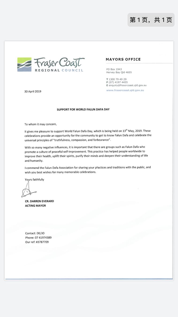 ![]() 图12:昆州弗雷泽海岸(Fraser Coast)市代理市长艾弗拉德(Darren Everard)给澳大利亚法轮大法学会发来支持信,祝贺法轮大法洪传二十七周年。 |