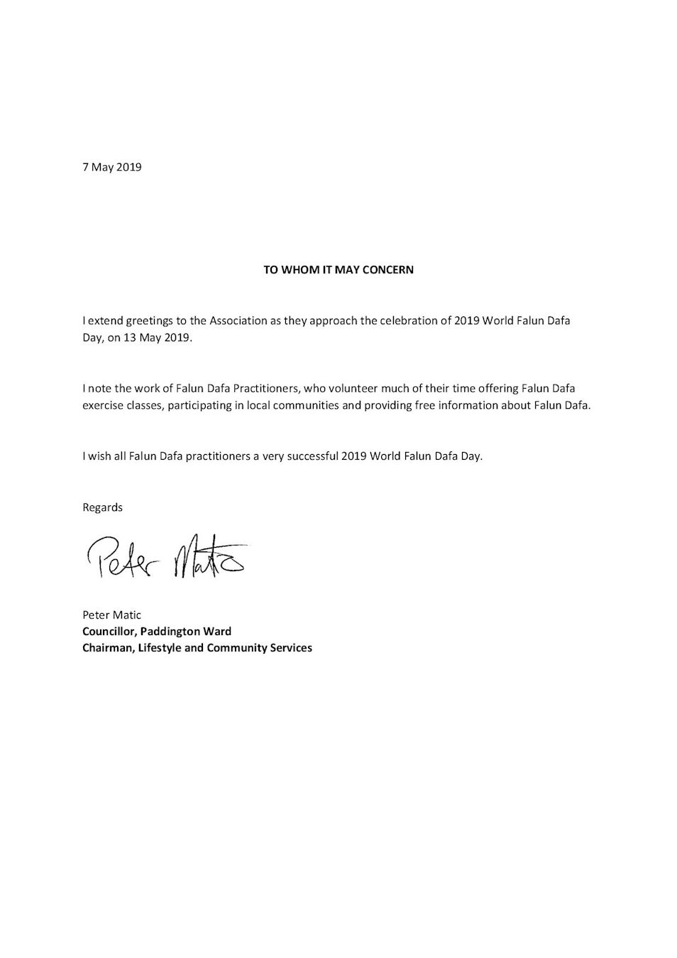 帕拉玛塔市议员菲尔‧布拉德利(Phil Bradley)在二零一九年的法轮大法日之际送上自己最美好的祝愿。他在贺信中表示:作为法轮大法的支持者,非常认同“真、善、忍”的价值观,“法轮大法的实践着重于改善身心健康,提升精神境界,加深对生命和宇宙的理解。我认为澳洲人可以更多地来推广这些价值观,并像法轮功学员那样拥有健康和有信仰的生活。”