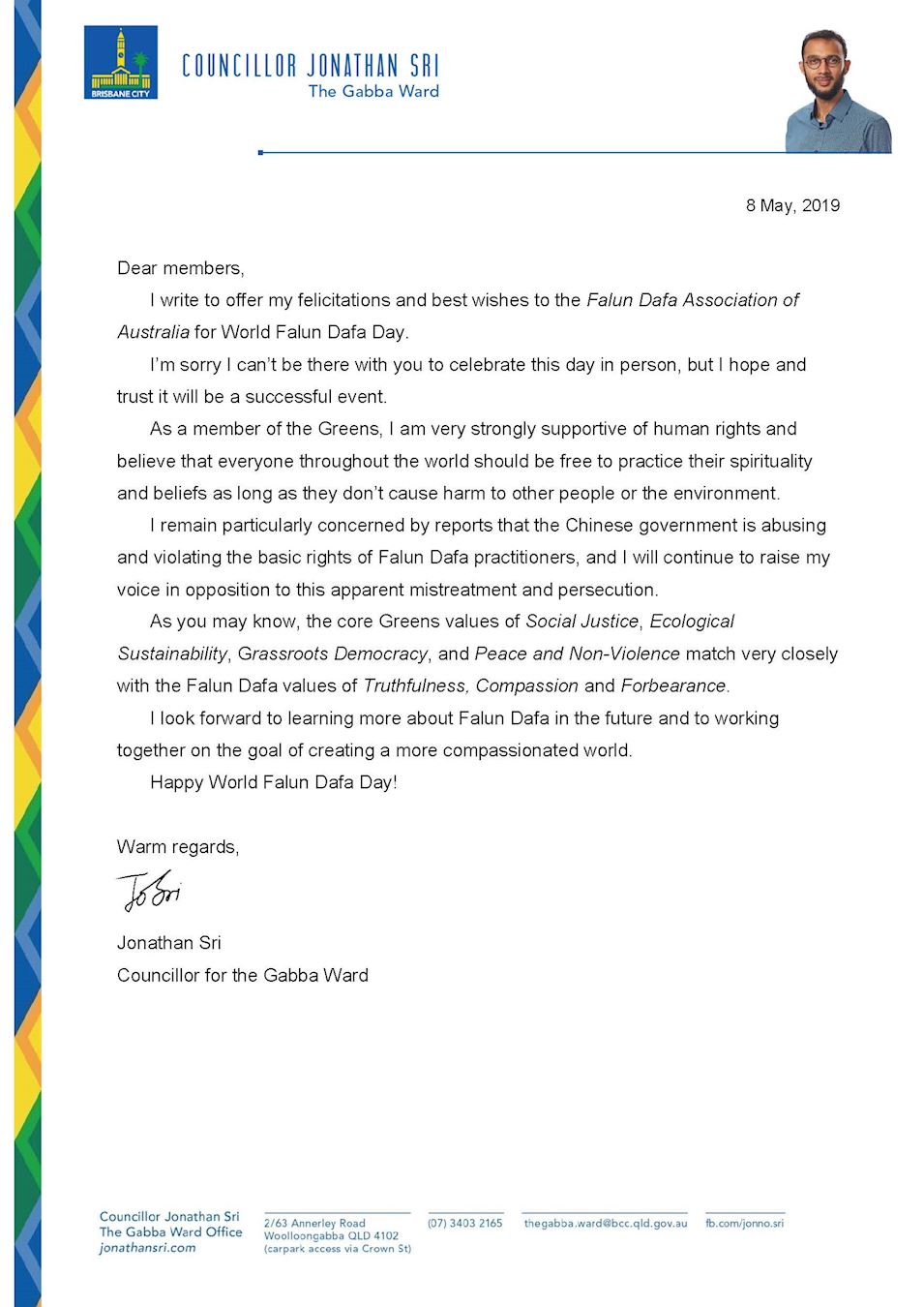 昆州布里斯本市市议员斯理(Jonathan Sri)贺信译文: