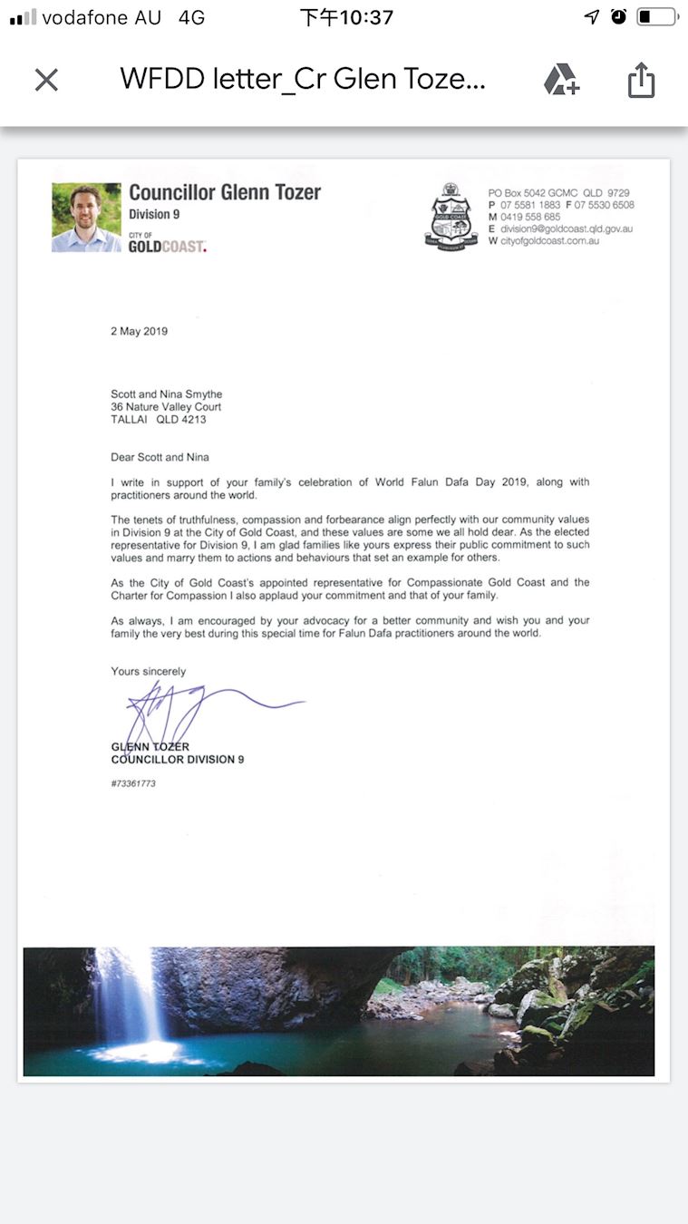 昆州黄金海岸市第九选区市议员图泽(Glenn Tozer)给昆州法轮大法学会发来贺信,祝贺法轮大法洪传二十七周年。贺信译文如下: