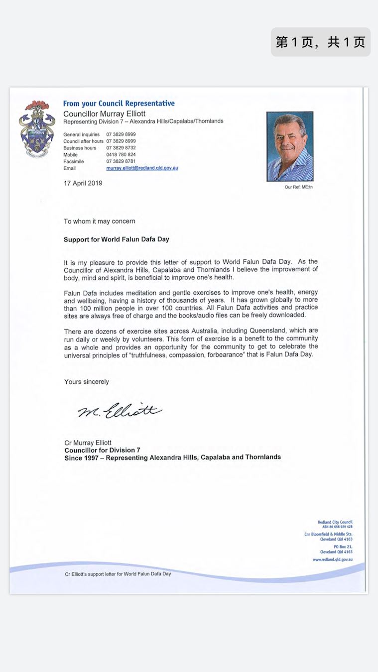 昆州瑞德兰市议会(Redland City Council)第七选区市议员艾利奥特(Murray Elliott)支持信译文: