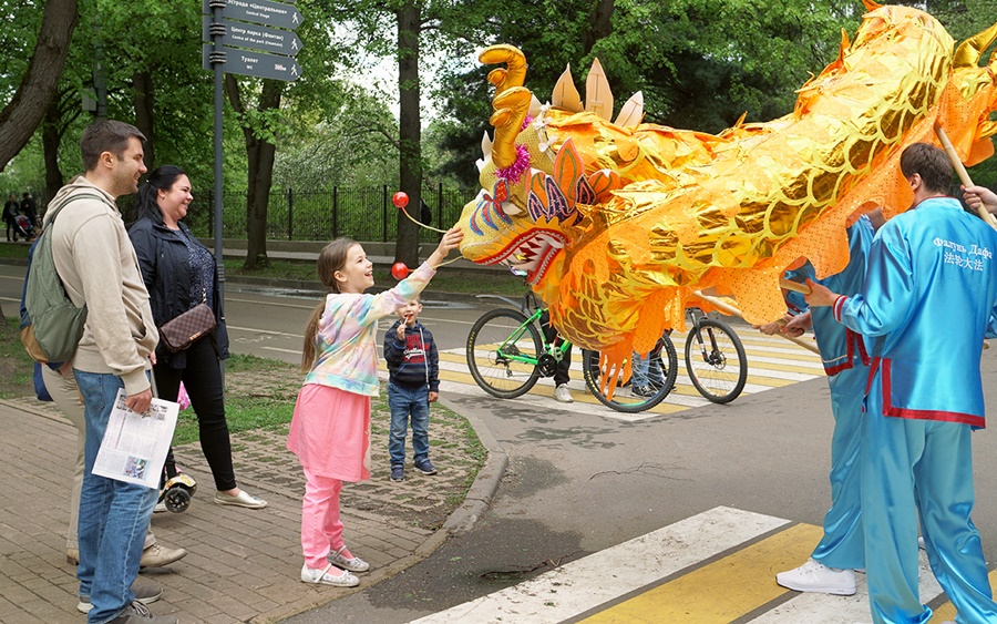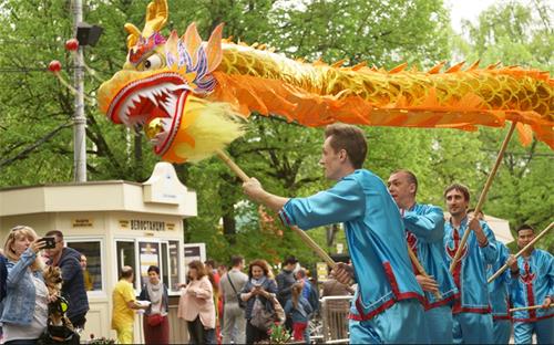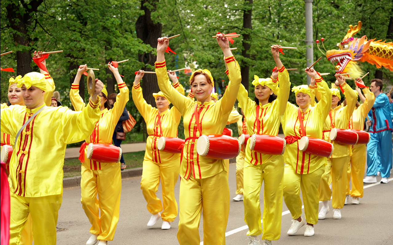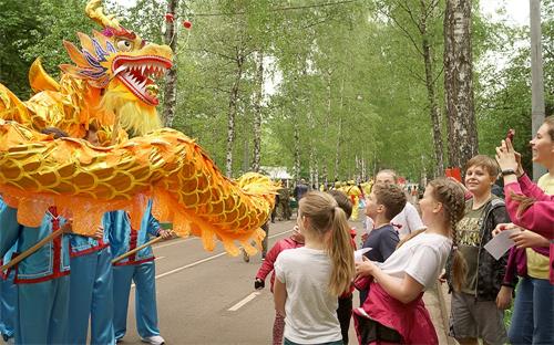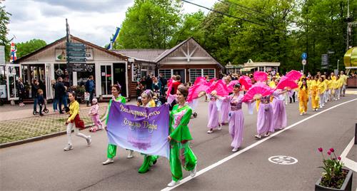 ![]() 图8~9:在莫斯科素科尔尼基公园(Sokolniki park)法轮功学员载歌载舞的游行 |