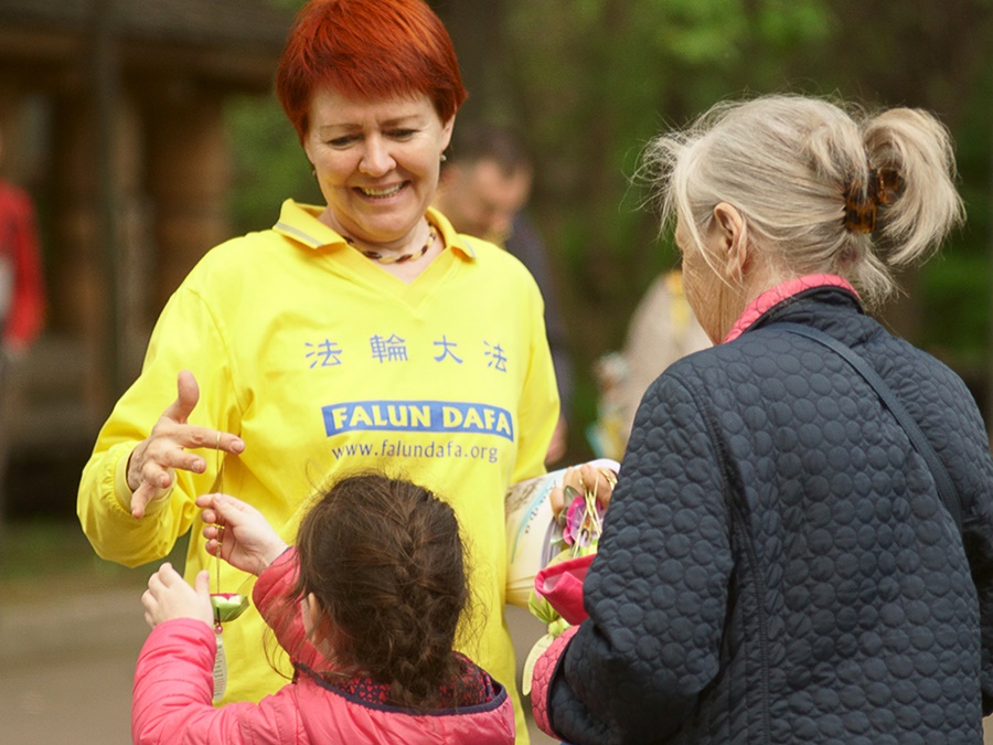 一对老年夫妇说道:“小孩子们表演的舞蹈太棒了。女孩们拿着伞跳得太好了。”听到她们都修炼法轮功后表示赞叹,并说回家后会仔细阅读资料传单。