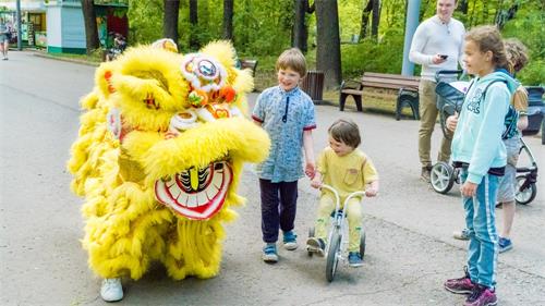 下午三点,法轮功学员的游行队伍开始缓缓行进,游行队伍由“仙女队”、“功法展示方阵”、“唐装队”、“舞龙队”、“腰鼓队”和“舞狮队”组成。沿着公园的主干道,伴随着“法轮大法好”的音乐徐徐行进,游人纷纷拿出手机等拍照录像。很多人收到了印有:“法轮大法好”和“真、善、忍”字样的小莲花,感到非常地高兴,接到信息传单后仔细阅读。