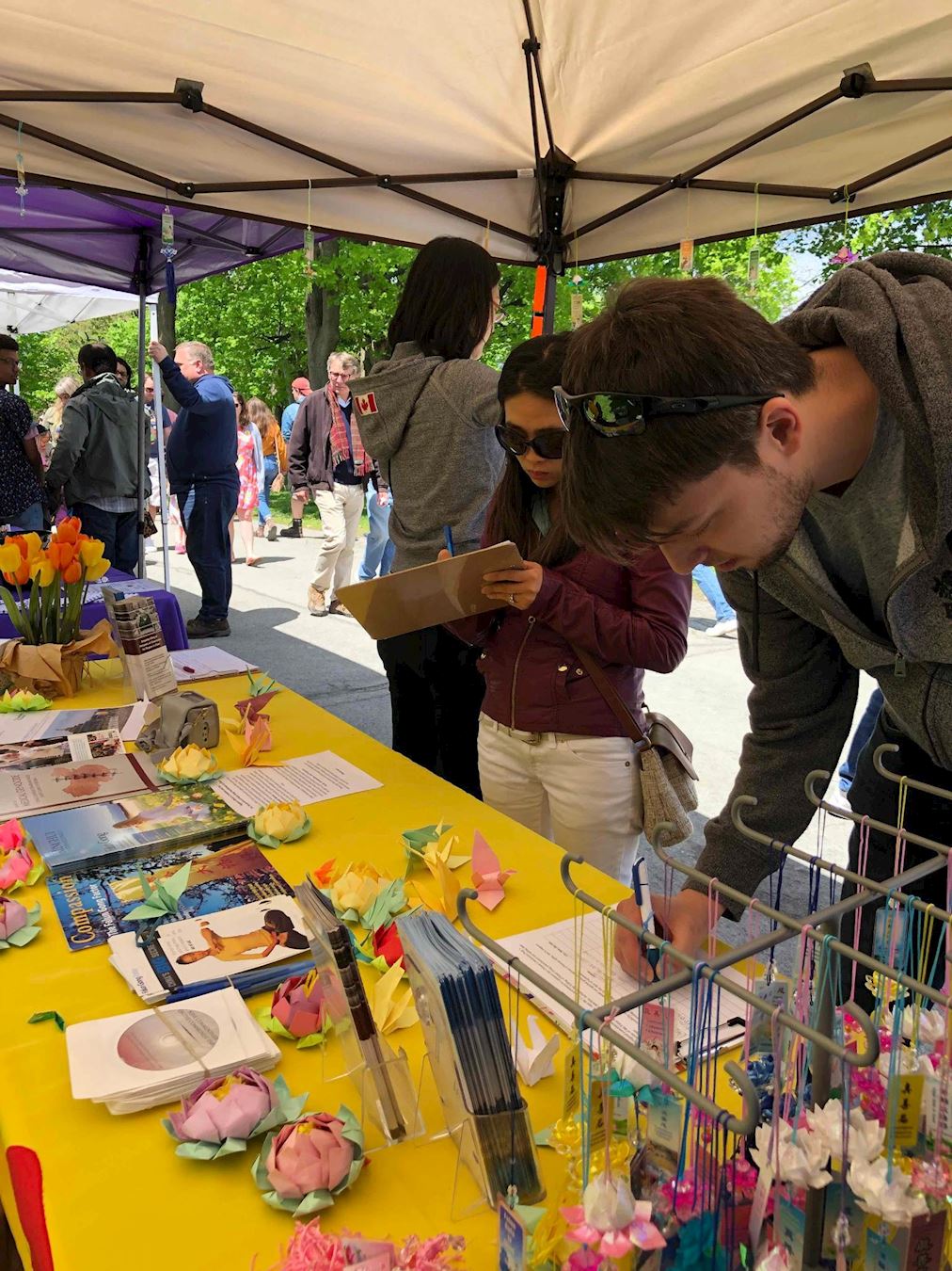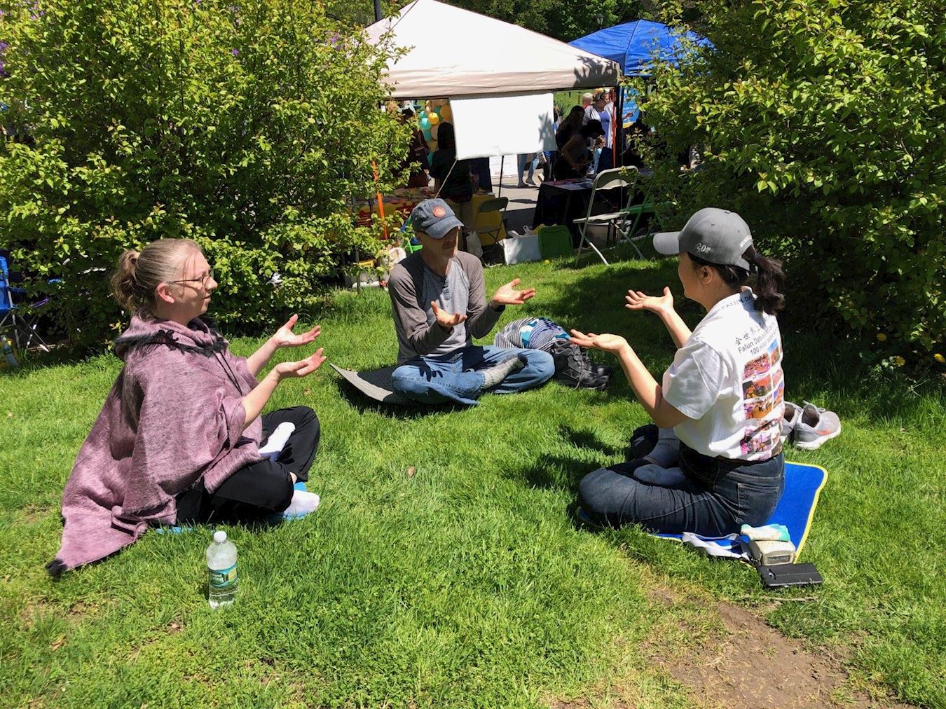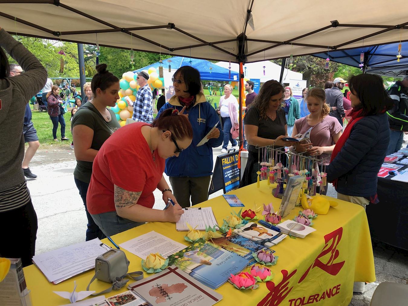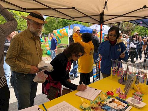 杰夫一直在寻找适合自己的灵修功法,几个月前他无意中在网上读到大法的信息。于是,周六五月十一日一早,就偕太太来到了大法的展位。杰夫告诉学员说,他知道法轮功正在遭受迫害,因为中共打压,所以他更要学。夫妻俩在制止中共迫害、活摘法轮功学员器官的征签表上郑重地签了名。杰夫和太太都想学功,学员和他俩在展位后面的草坪上席地而坐,学炼第五套功法,并为他们解答问题。