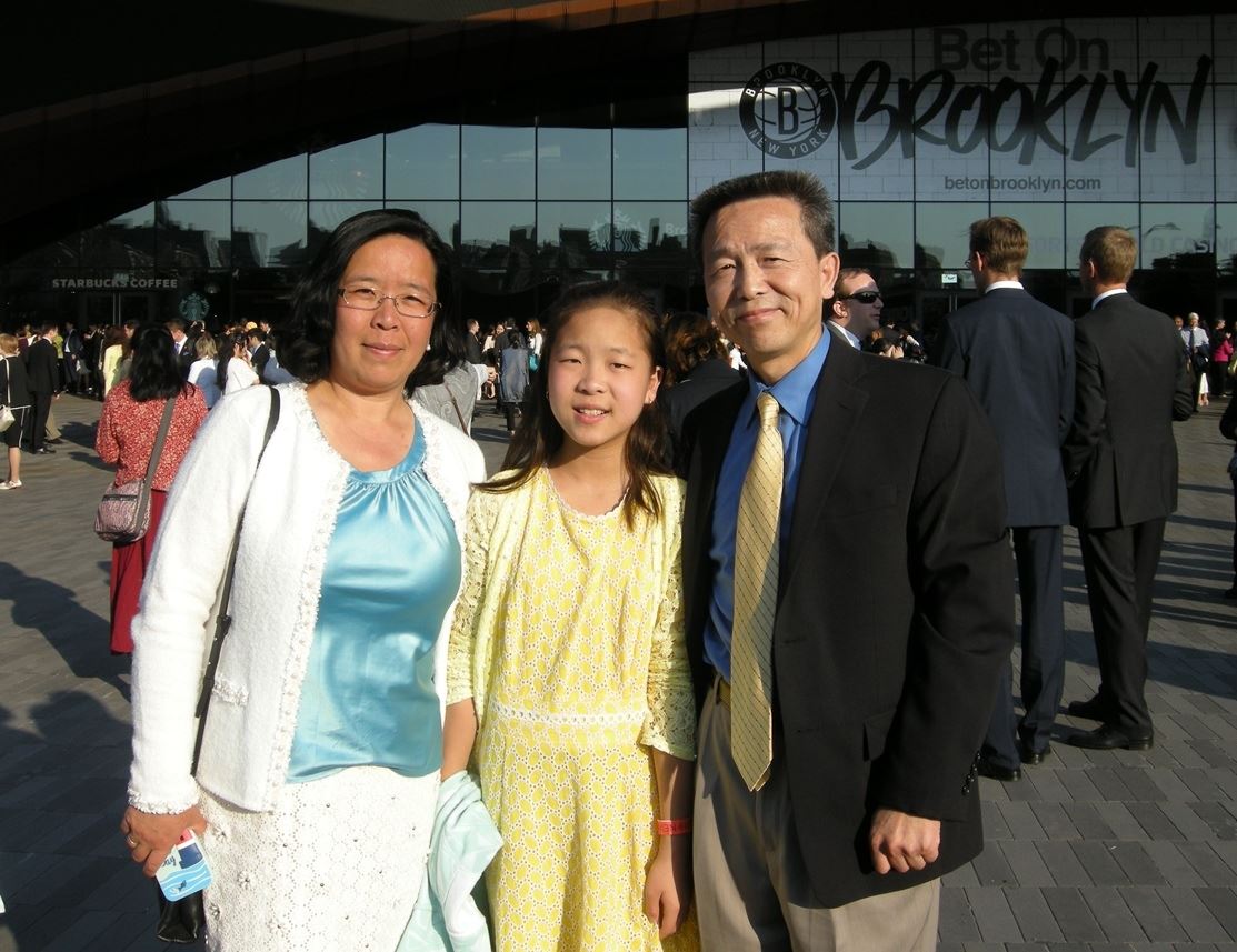 ![]() 图2:纽约法轮功学员冯玲和先生吴胜勇、女儿Emily |