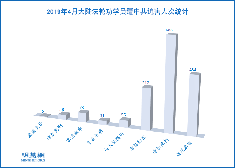 据明慧网信息统计,二零一九年四月份,中共绑架688名法轮功学员,骚扰434人(其中212人已经回家,1人正念闯出,4人失联。312人被非法抄家,至少有32对修炼法轮功的夫妇被迫害,其中绑架17对夫妇,骚扰15对夫妇),强制关押在洗脑班55人,批捕31人,判刑38人,庭审73人。