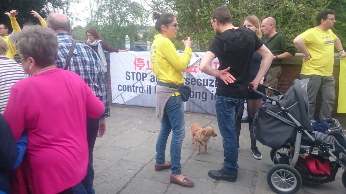 四月二十五日,来自托斯卡纳大区(Toscana)的许多法轮功学员聚集在佛罗伦萨的Lungarno Diaz街道上。这条大街位于佛罗伦萨的历史中心附近,大部份运载游客的大巴都会选择在这里停车。每天会有数千名游客来城市里参观,而且大部份都是旅游团,他们的行程时间都非常紧,所以道路上的行人和车辆一直络绎不绝。