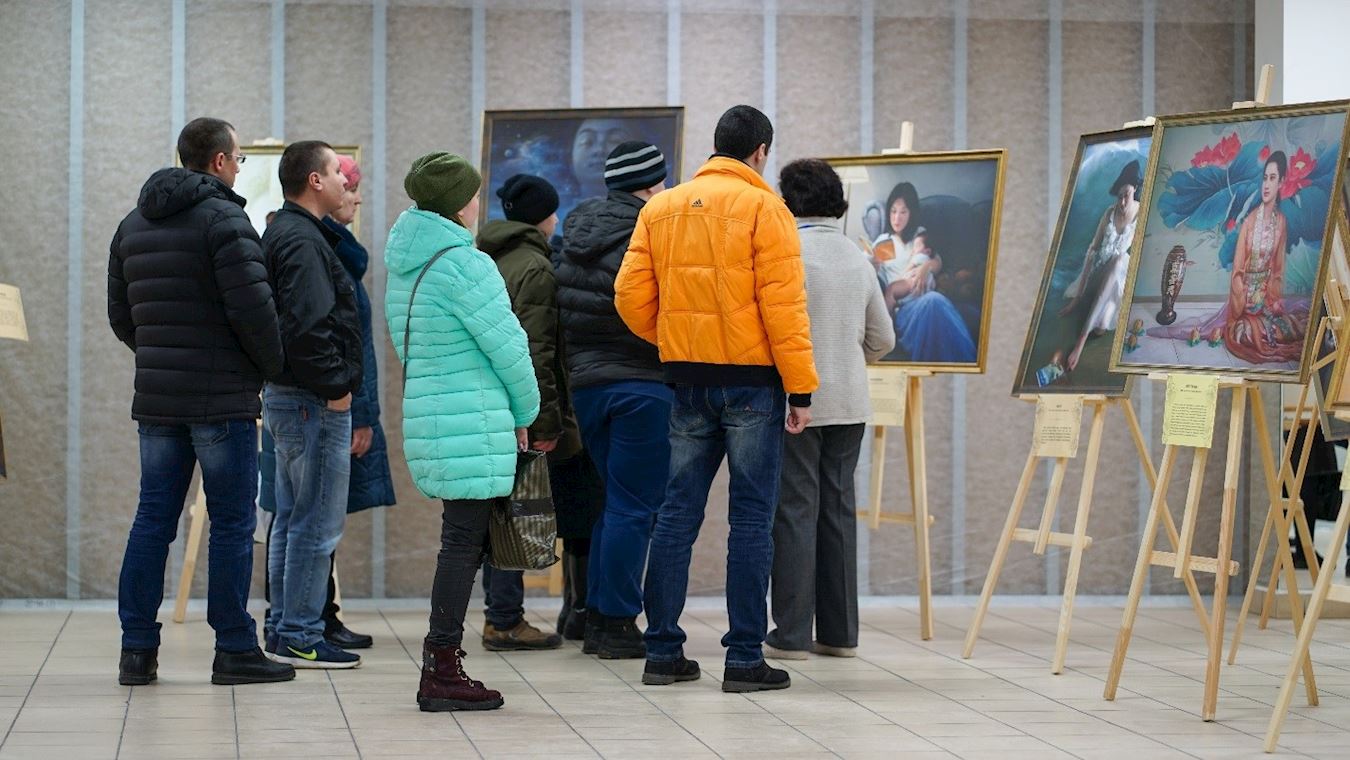 ![]() 图1~6:坐落在俄罗斯伏尔加河岸的阿尔扎马斯(Arzamas)市首次迎来了“真、善、忍”国际美展,民众驻足在画作前,或合影留念 |