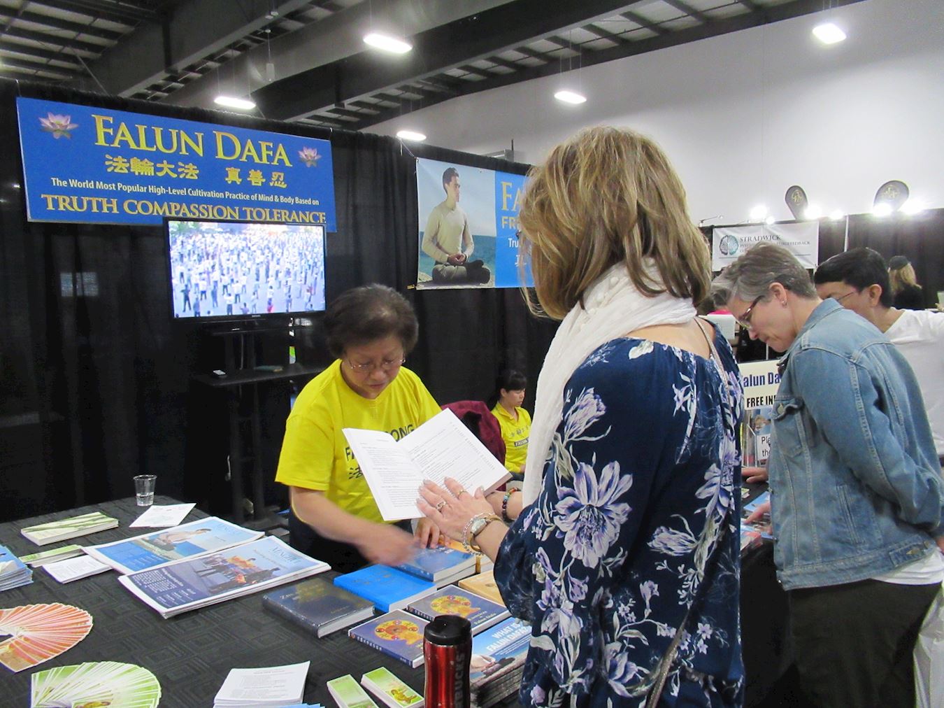![]() 图1:身心健康展上,感兴趣的来宾阅读法轮功书籍。 |