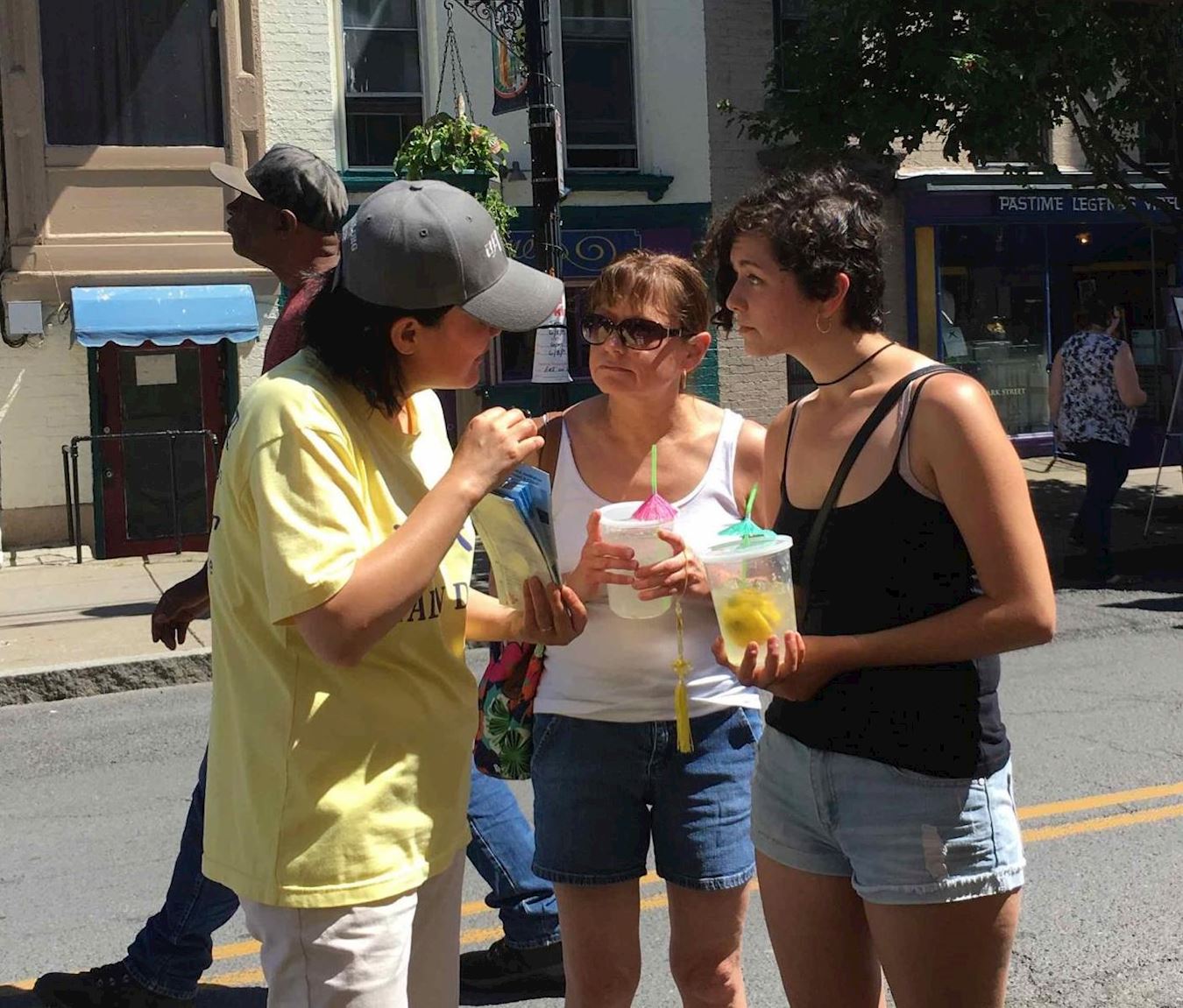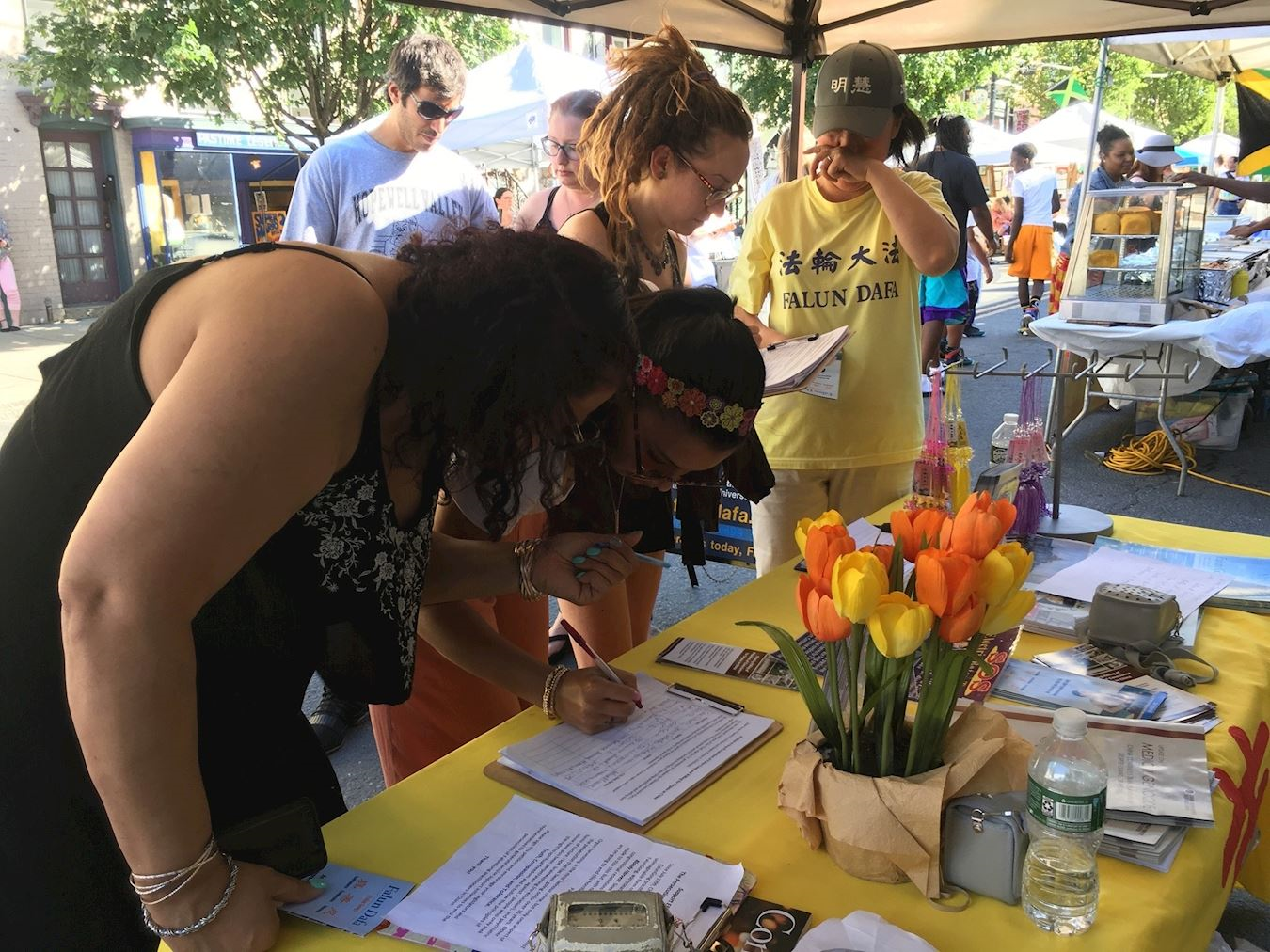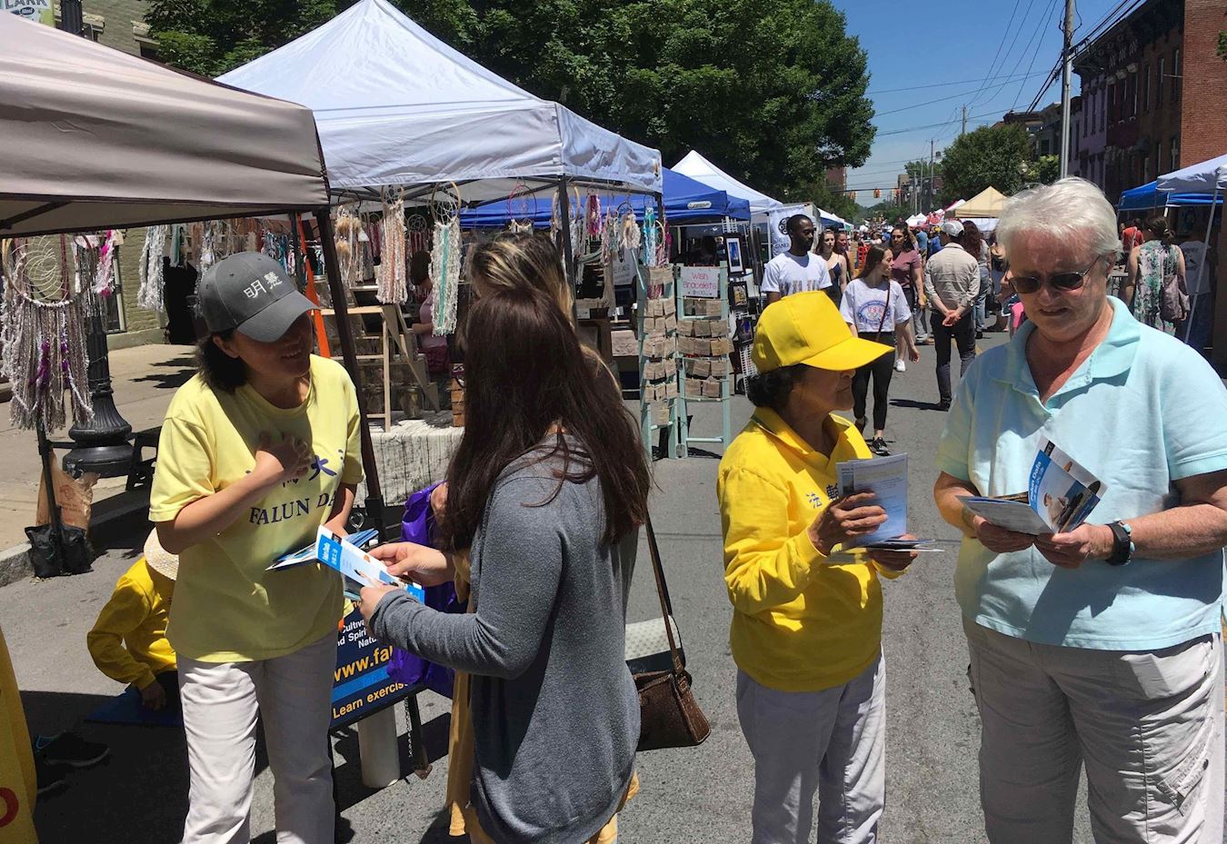 当天蓝天白云,夏意浓浓,满街都是惬意漫步的游人,法轮功学员展位前人流不断。人们或站在展位不远处观看学员炼功,或静静听学员讲真相,或明白真相后主动上前来签名。