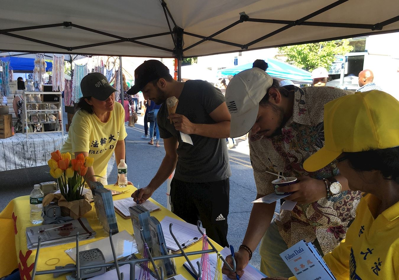 一位青年男子签完名,又带来他的两位朋友,让他们来听真相。朋友们一起签好名后,感谢法轮功学员告诉他们真相。