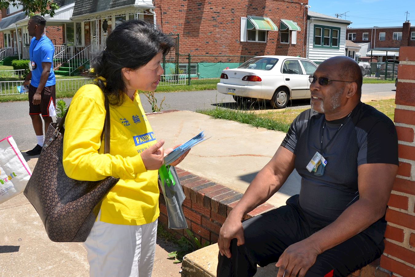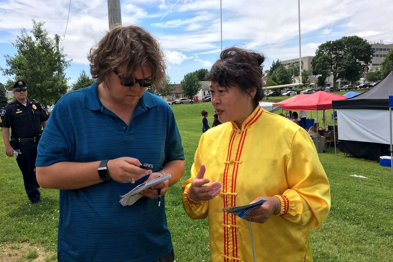 图8:当地最大报之一《德拉华郡每日时报》的记者在采访法轮功学员。