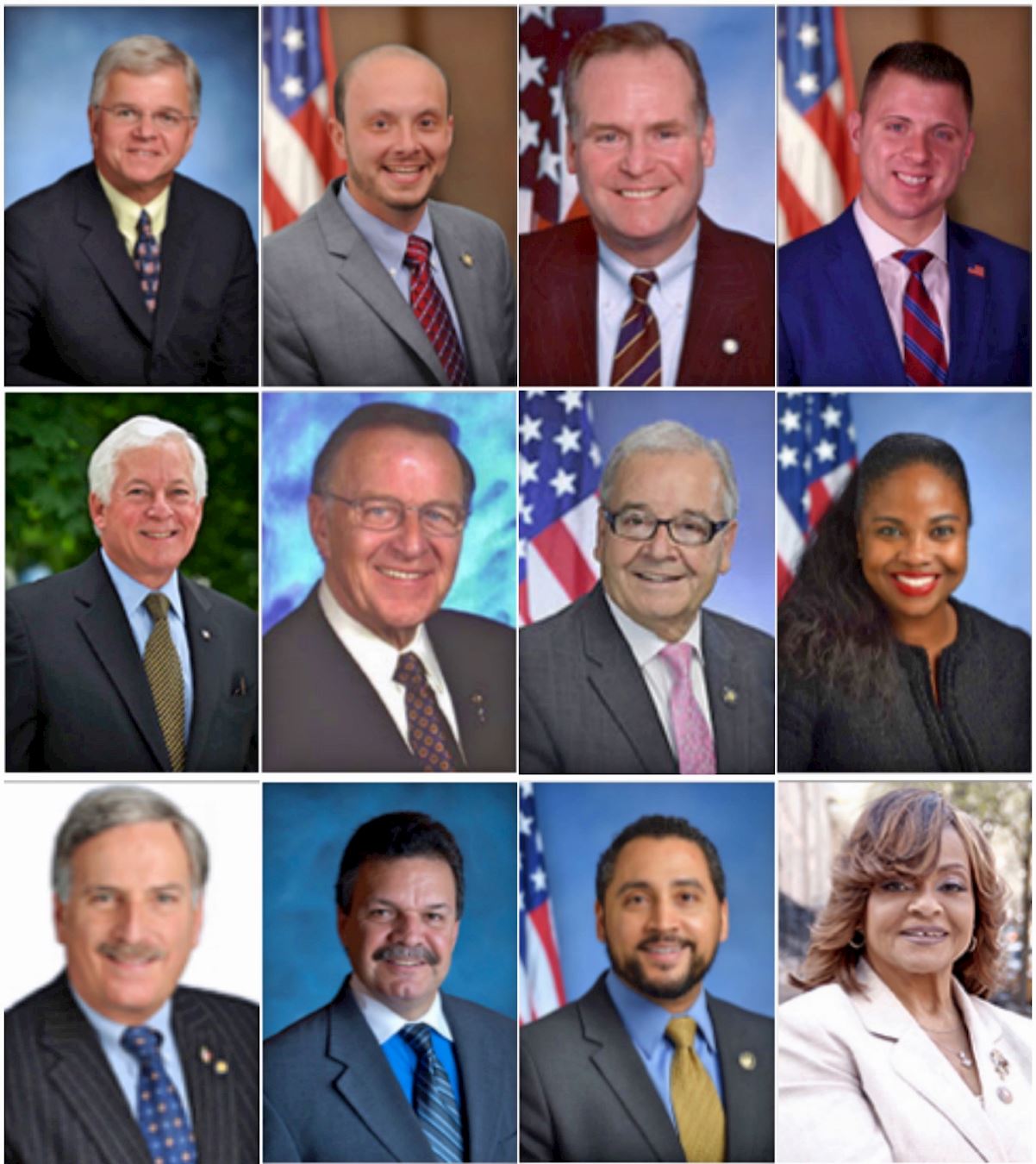 '图1:上图从左至右、从上至下,分别是纽约州第一选区众议员小弗雷德·蒂勒 (Fred W. Thiele, Jr.)、第七选区众议员安德鲁·加尔巴里诺(Andrew R. Garbarino)、第八选区众议员迈克尔·菲茨帕特里克(Michael J. Fitzpatrick)、第九选区众议员迈克·利佩特里(Mike Lipetri)、第十三选区众议员查尔斯·拉维恩(Charles D. Lavine)、第十四选区众议员大卫·麦克唐纳(David G. McDonald III)、第十六选区众议员阿诺乔尼·杜尔索(Anthony D'Urso)、第十八选区众议员泰勒·雷诺(Taylor Raynor)、第二十四选区众议员大卫·韦普林(David I. Weprin)、第五十一选区众议员费利克斯·奥尔蒂斯(Félix W. Ortiz)、第六十八选区的众议员罗伯特·罗德里格斯(Robert J. Rodriguez)和第七十选区众议员伊内兹·狄更斯(Inez E. Dickens)'