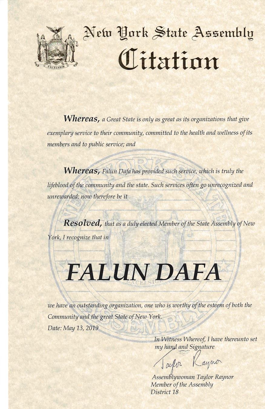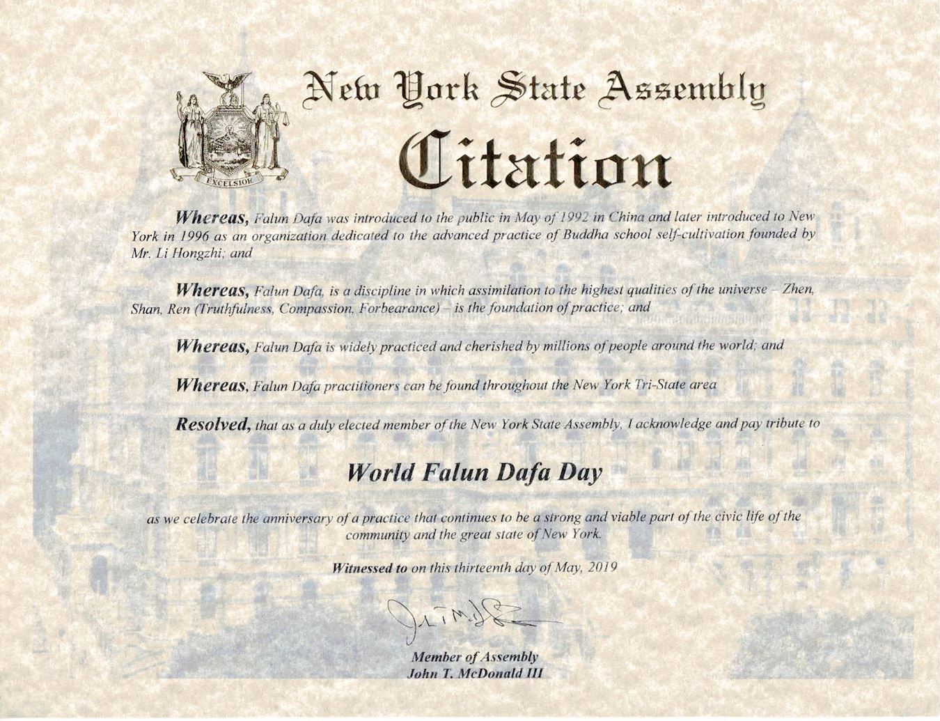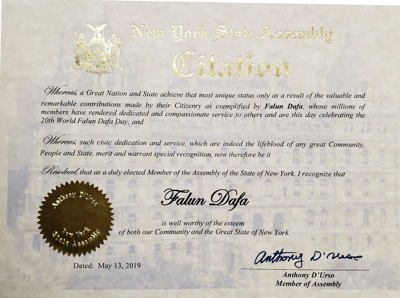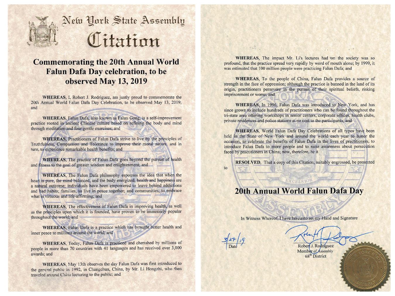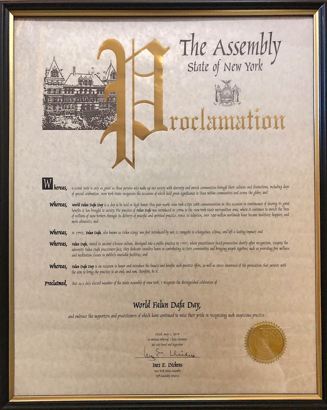 特此宣告, 作为纽约州议会正式当选的议员,我赞赏“世界法轮大法日”的杰出庆祝活动,并拥抱那些为法轮大法而感到骄傲的支持者和修炼者。