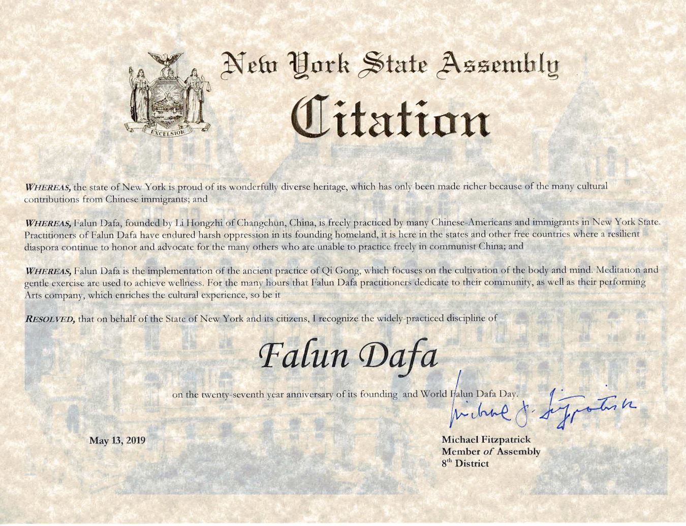 【明慧网二零一九年六月二十日】今年是法轮功弘传世界二十七周年暨第二十届世界法轮大法日”, 纽约州继四十五位众议员共同签署恭贺函之后,又有十二位州众议员各自颁发褒奖、贺信颂扬“真、善、忍”是普世价值,赞扬法轮大法对社区的贡献和法轮大法洪传世界的盛况。