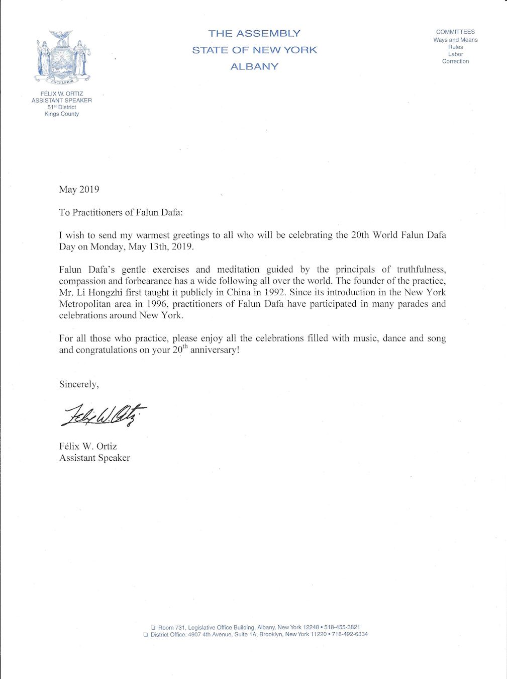 '图13:第五十一选区众议员费利克斯·奥尔蒂斯(Félix W. Ortiz)发贺信称颂大法,祝贺第二十届世界法轮大法日。'