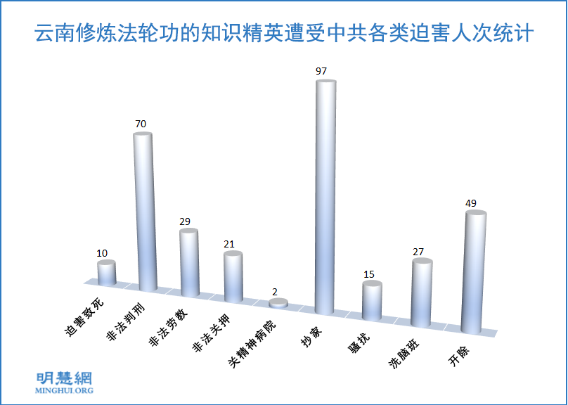 ![]() 图1:云南修炼法轮功的知识精英遭受中共各类迫害人次统计 |