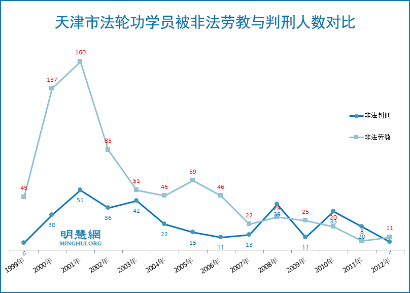 ![]() 天津市法轮功学员被非法劳教与判刑人数对比 |