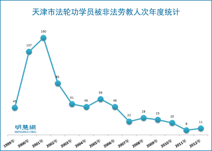 ![]() 图:天津市法轮功学员被非法劳教人次年度统计 注:197名法轮功学员遭劳教迫害的年份不祥,未计入图表 |