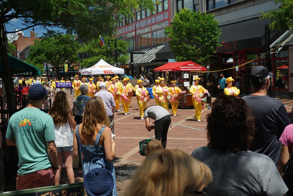 许多市民及游客驻足观看法轮功学员展示五套功法。家住沃特伯里镇的罗尼 (Roni Golden)医生询问住家附近的炼功点,想学功。