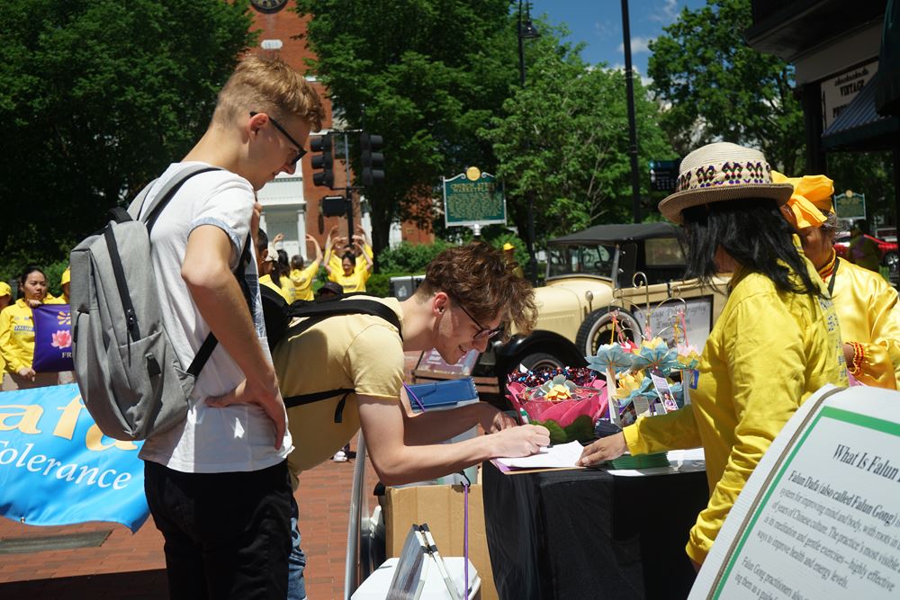 从中国大陆来的年轻大学生艾米(Amy Siu),看到宁静平和的功法,想介绍法轮功给远方的双亲学炼。她拿取真相资料并留下自己的电子邮件以备将来继续联系。