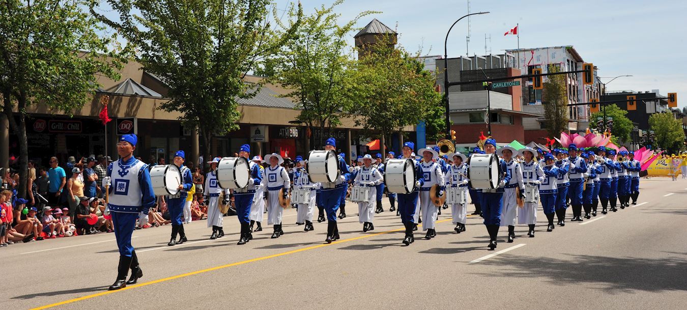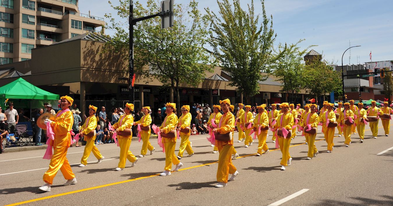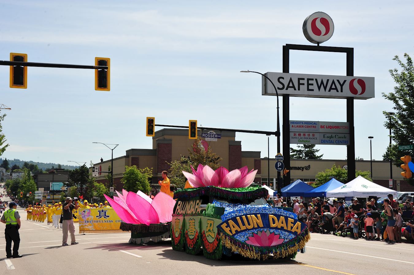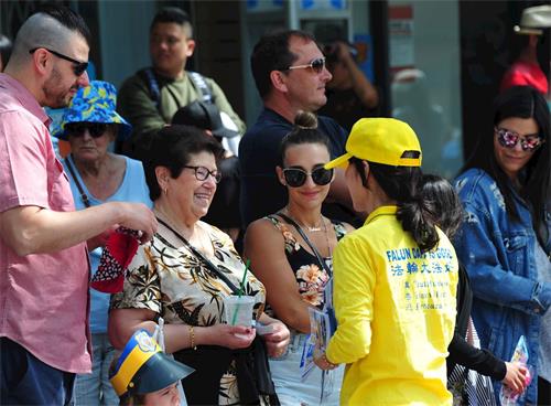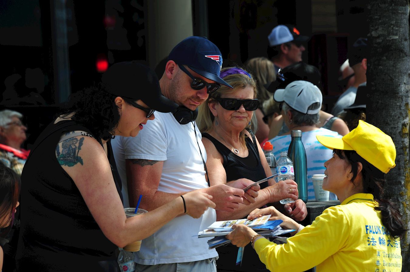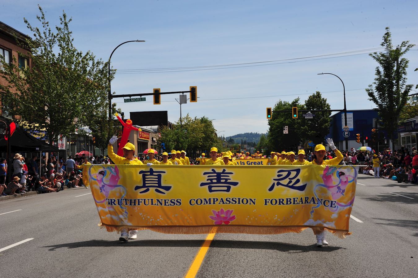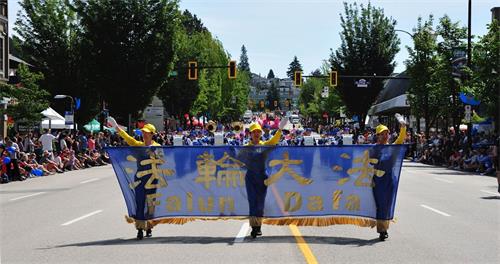 六月一日天气晴朗,道路两边挤满了观看游行的民众,本那比市(Burnaby)有很多华人居民,他们也在路边观看游行。法轮功学员的游行队伍包括天国乐团,腰鼓队,法轮功功法演示队和花车等等。因为多次参加本那比市脱帽节游行,法轮功学员是观众所熟悉的队伍,一路走来受到热烈欢迎。沿途不断可以听到观众们用中英文谈论,“法轮功来了”,“还有乐队,音乐真好”,“花车好美呀”,“法轮功好多人呀”。还有很多观众手拿法轮功真相资料在路边阅读。