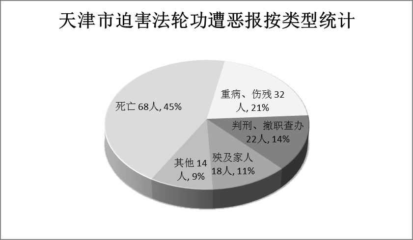 据明慧网报道不完全统计,自一九九九年七月份至截稿日,天津市因参与迫害法轮功而遭恶报的各类人员多达154人。遭报死亡、自杀者68人,占比高达44.7%;身患重病、伤残及车祸等32人,被判刑、双规、撤职查办者22人,殃及家人18人,其它14人。