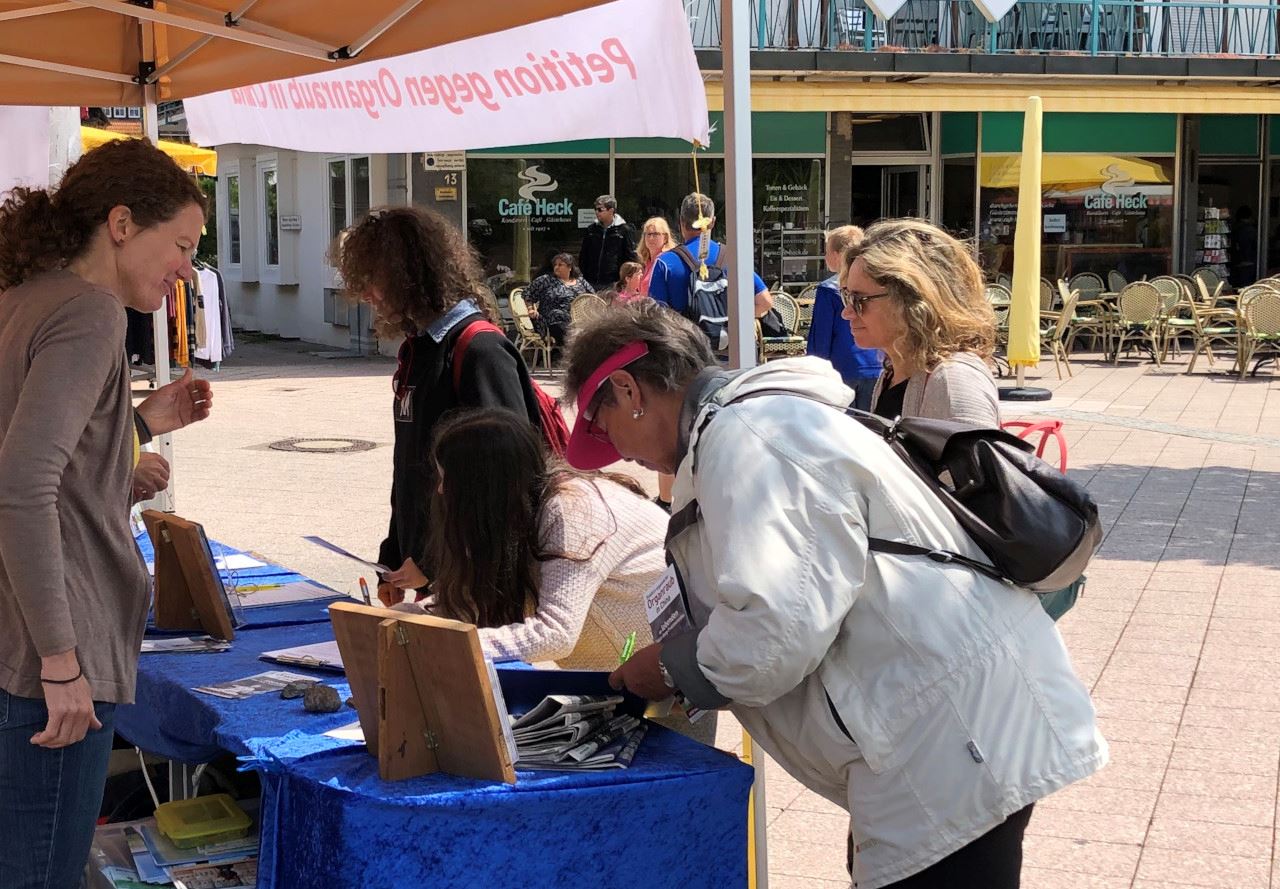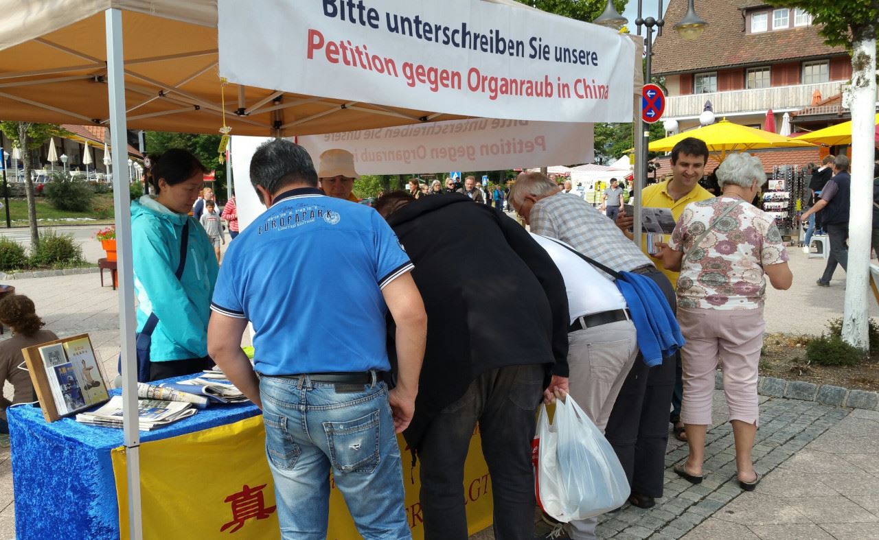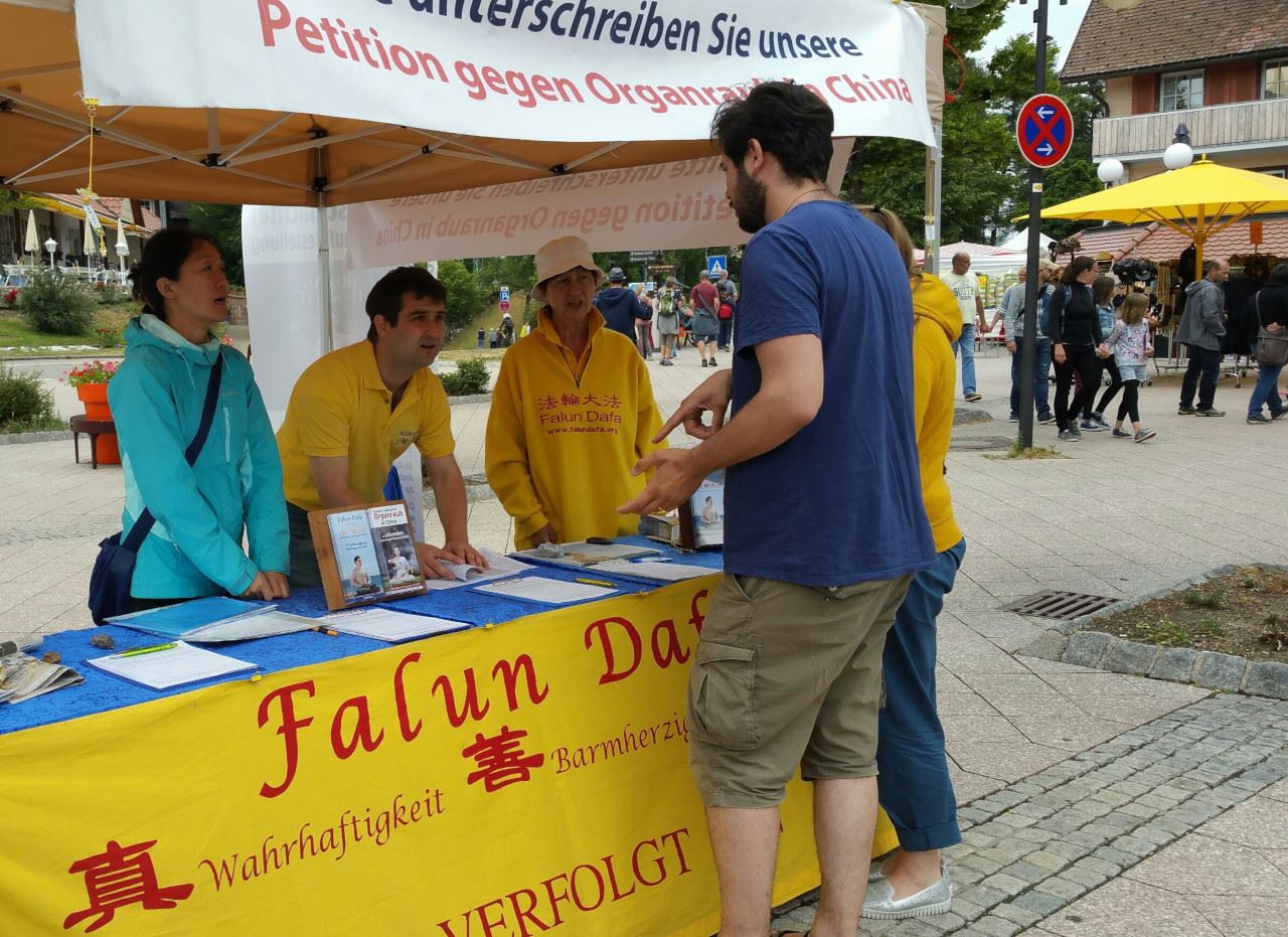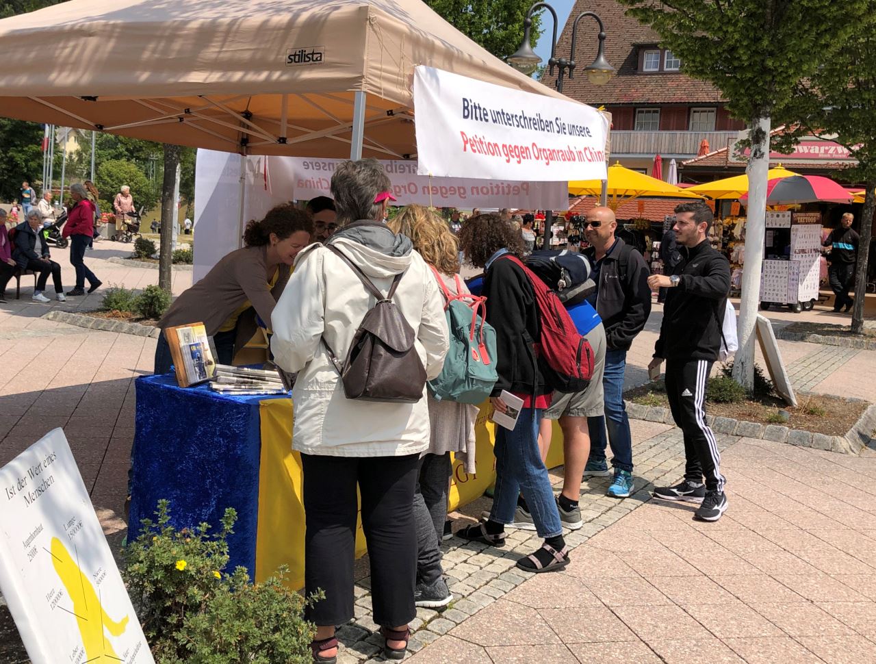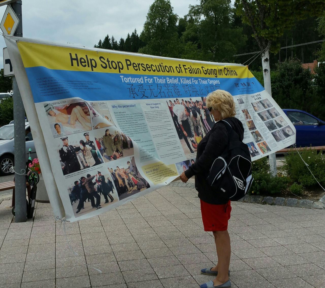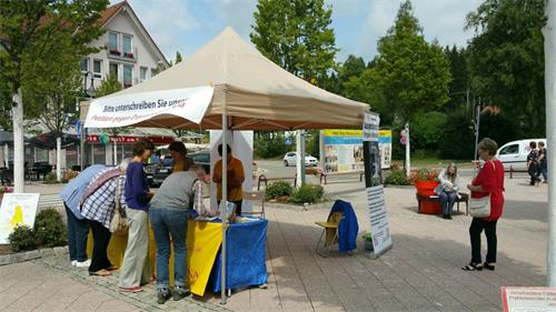 2019年7月13日,周六的德国旅游胜地缇缇湖,来自世界各地的游客络绎不绝,其中也有不少来自中国大陆的旅游团。法轮功学员的信息台位于景点入口处,写有“法轮大法好”的横幅和大幅的反映迫害真相及大法弘传盛况的横幅十分醒目。