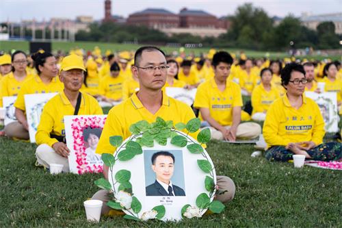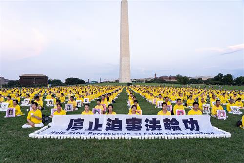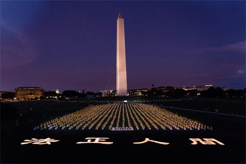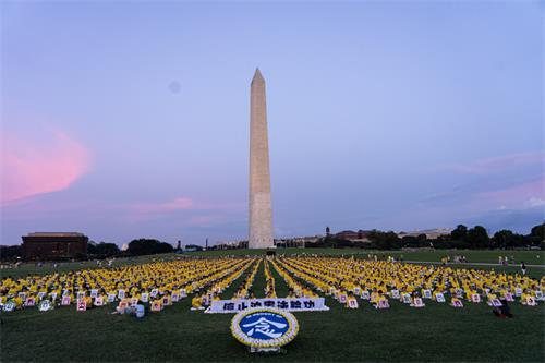 白天的潮热有所减轻,游客和当地的居民在华盛顿纪念碑下散步、跑步、骑自行车、或与朋友家人聊天。这时一群穿着黄色T恤衫的人们整齐地在草坪上排开。舒缓优美的音乐开始播放。开始时天还没有完全黑。这样的景象和音乐吸引了很多人驻足观看。今年法轮功学员还设立了一个屏幕,在屏幕上轮流播放不同的画面和简单信息,如“悼念被中共迫害致死的法轮功学员”,“法轮功烛光守夜”,“为什么迫害会发生”等。