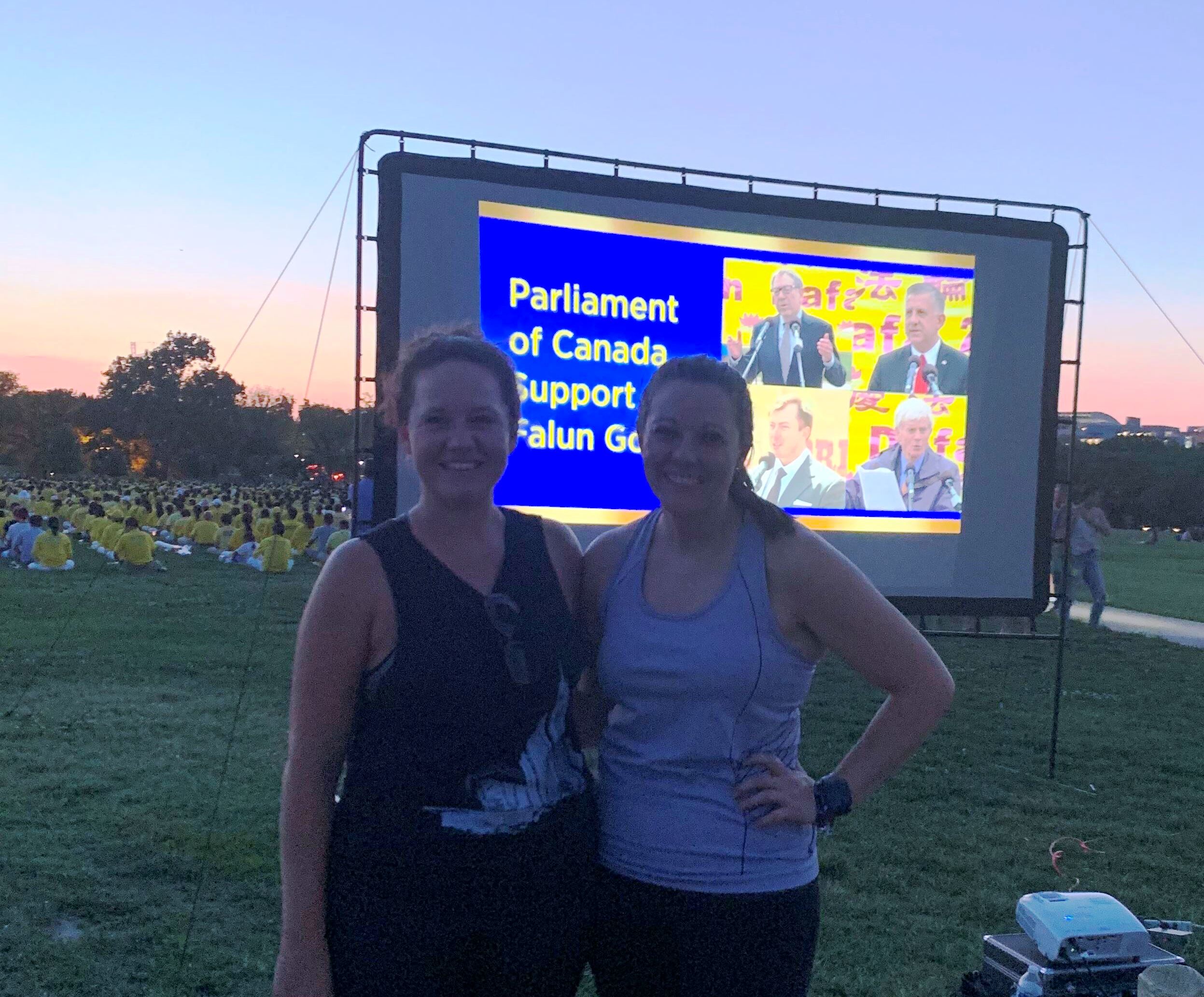 ![]() 图11:金·司考特(Kim Scott)(右)和玛丽莎·布朗( Marissa Brown)在法轮功烛光守夜投影图片前留影 |