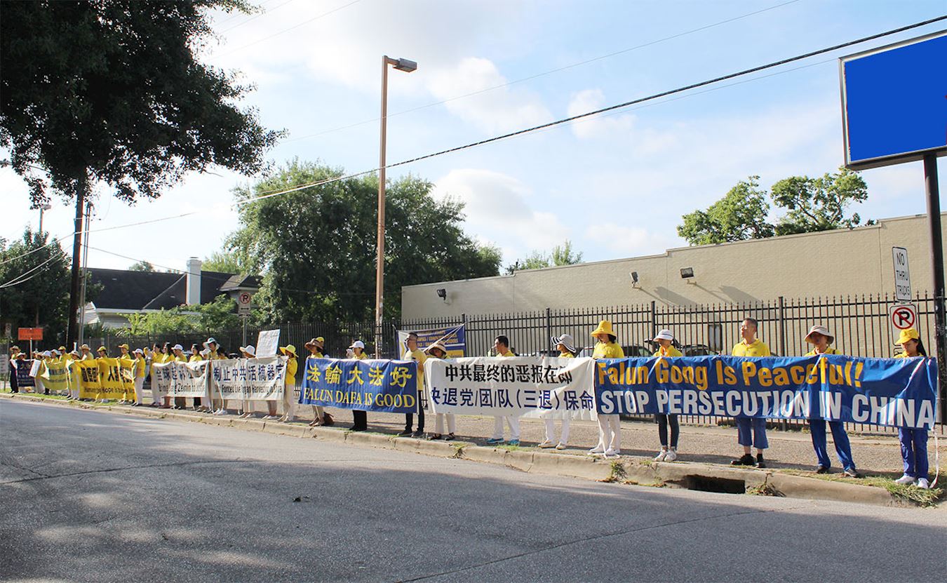 ![]() 图1:反迫害二十周年, 休士顿学员中领馆前集会揭露迫害 |