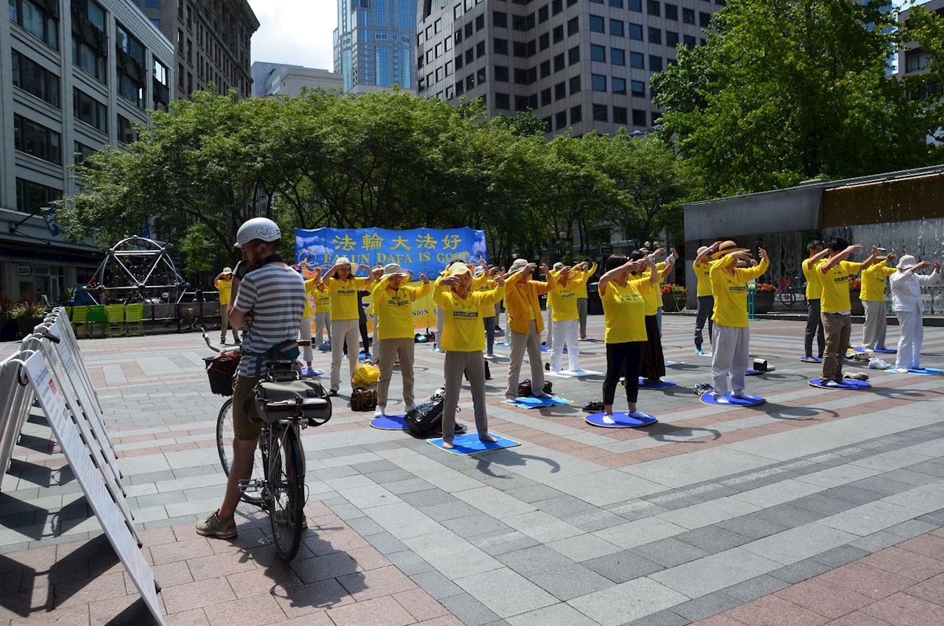![]() 图1~2:二零一九年七月十三日,在“七二零”反迫害二十年之际,西雅图法轮功学员在市中心的西湖公园(Westlake Park)举行集会,向过往民众传播真相 |