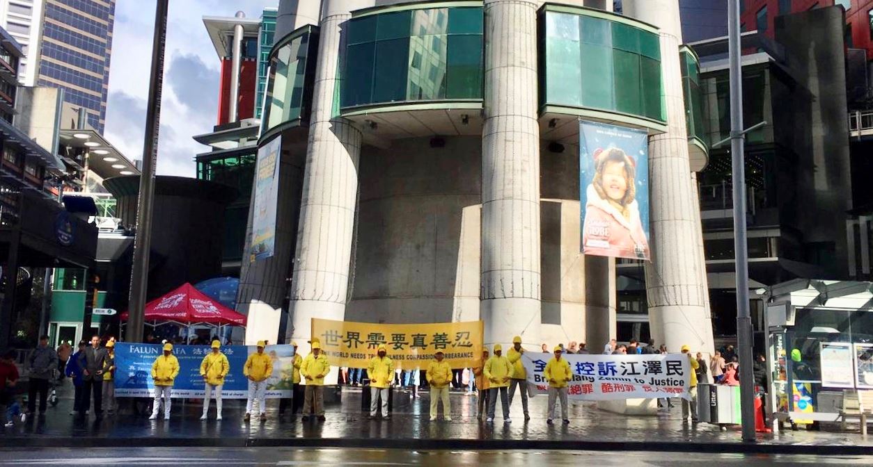 图3:新西兰法轮功学员天空城(Sky City)炼功讲真相。