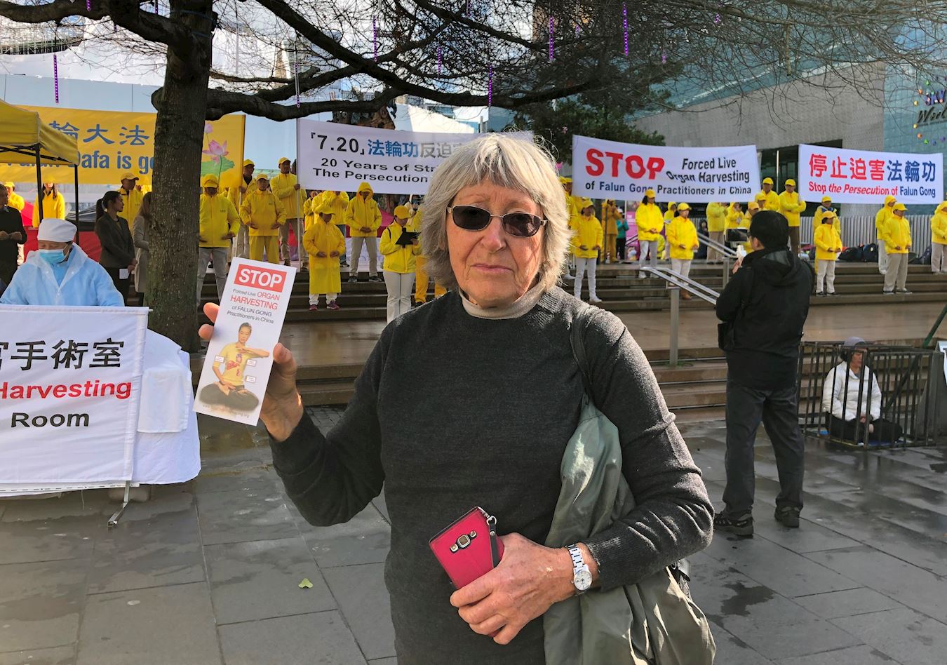 帕特·肖(Pat Shaw )表示:“有一天我在工作的时候,来了一位律师告诉我,昨晚他读了一本叫《屠杀》的书,他竟然手不释卷,读了一整夜。第二天我就去图书馆借了一本崭新的《虐杀》,这是一本很好的书,让我十分的震惊。只可惜我身边的人读过这本书的太少了。我还在奥克兰电影院,看了一部电影叫《血刃》,告诉人们(中共)活摘法轮功学员器官的事。这是一部非常好的电影,但是我不知道谁还看了?人们都看了吗?就象今天你们在这里集会,为什么那些主流媒体不来报导?你们应该让电视台播放电影《血刃》、采访《屠杀》这本书的作者。那些从共产主义国家出来的中国留学生认为,在监狱里关的就是罪犯,他们太害怕了都不敢看,他们真的应该上图书馆去看一看真相,我真希望在电视上也看到关于你们的节目。”