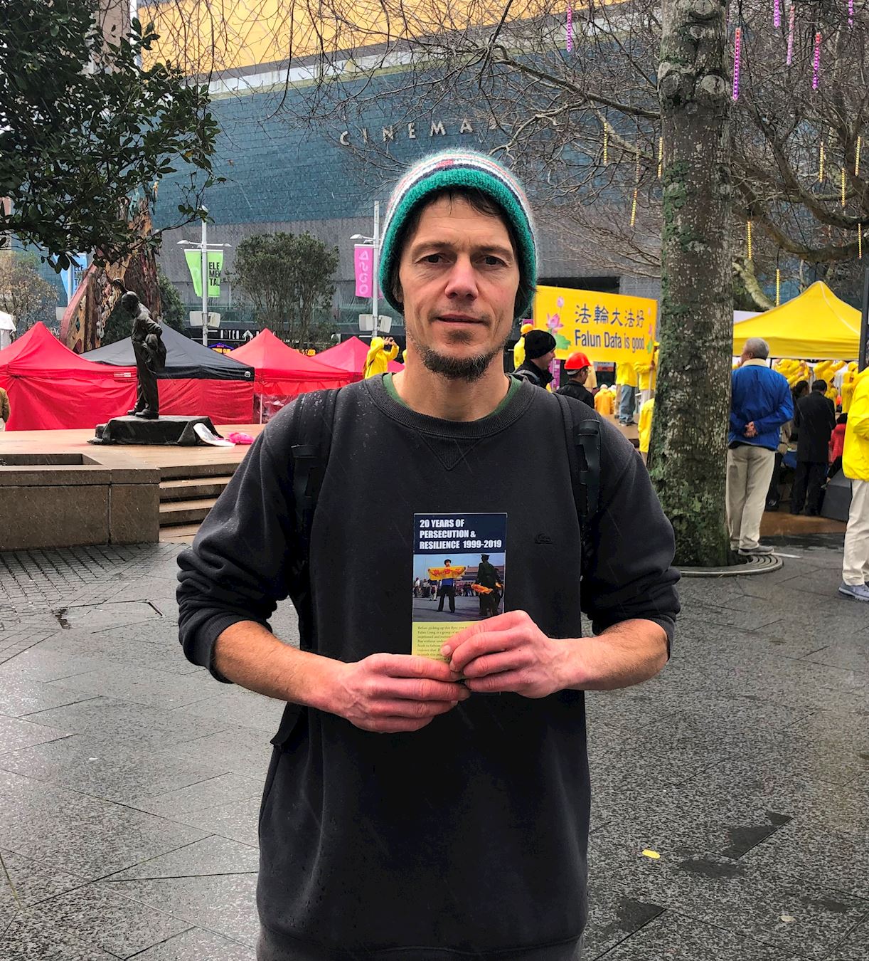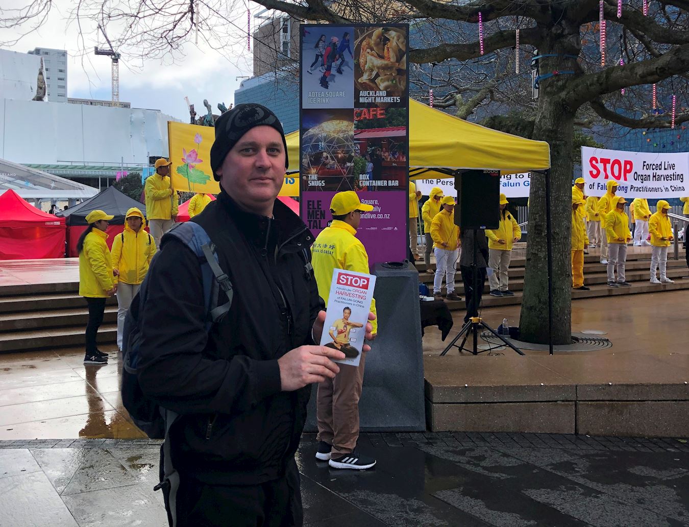 杰森·布鲁克(Jason Brooke)在奥克兰一家医院工作。多年前在堪培拉,法轮功学员给了他一张真相光盘,看完后,他感到非常震惊。因此他了解了中共的斗争史、活摘人体器官、镇压有信仰以及打坐修炼的人。他激动地说:“这让我很伤心,没有人应该因为有自己的信仰而被迫害。没有得到同意活摘人体的器官,就完完全全是错的。就是因为他们有不同的见解和信仰,把他们投入监狱,让他们生活悲惨,这都是错的,非常错的!新西兰政府应该站出来发声,告诉中共这一点!新西兰政府还应该发表公开声明,明确支持这些站在这里的人(反迫害的法轮功学员),努力让民众了解这场迫害。法轮功学员们应该让更多新西兰人了解真相,即使真相不忍目睹。”