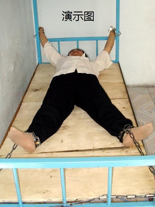 六月初看守所开始对他加重迫害,上拉板酷刑。把他双手、双脚用手铐脚镣铐在铺板上呈大字型拉直,不能翻身不能动,灌食的管子一直插在胃里不拔出来。