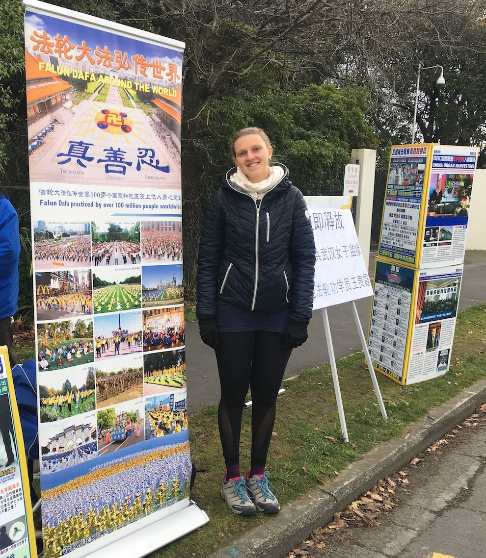 来基督城打工度假的法国姑娘塞琳(Celine),一月前在教堂广场偶遇法轮功学员,她被法轮功优雅的炼功动作所吸引。学员向她介绍了法轮功以及法轮功在中国大陆被中共迫害的情况,她马上要求学炼法轮功,并在征签表上签字支持法轮功反迫害。