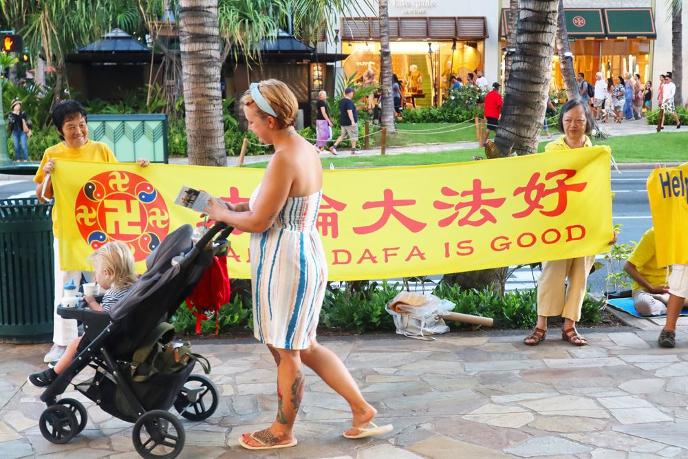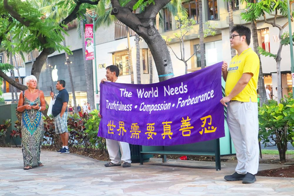 二零一九年七月二十日下午四点,夏威夷部份法轮功学员来到当地著名的旅游景点威基基海滩(Waikiki Beach)附近的商业步行街,在街边拉起一道道真相横幅,向来自世界各地的游人们传递法轮大法的美好,也以此纪念法轮功反迫害二十年。