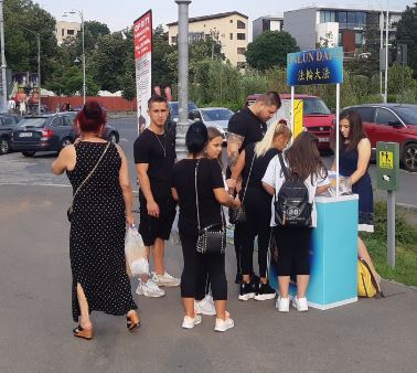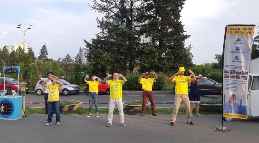 之后,法轮功学员们来到中领馆旁边的Herăstrău公园讲真相和集体炼功。这个公园是布加勒斯特最大的自然保护区公园,也是各个国家来罗马尼亚游玩的旅客的必游之地。法轮功学员们在该公园的地铁口摆上真相展板和条幅,向过往行人发资料,揭露中共持续迫害法轮功的真相并向大家展示功法。