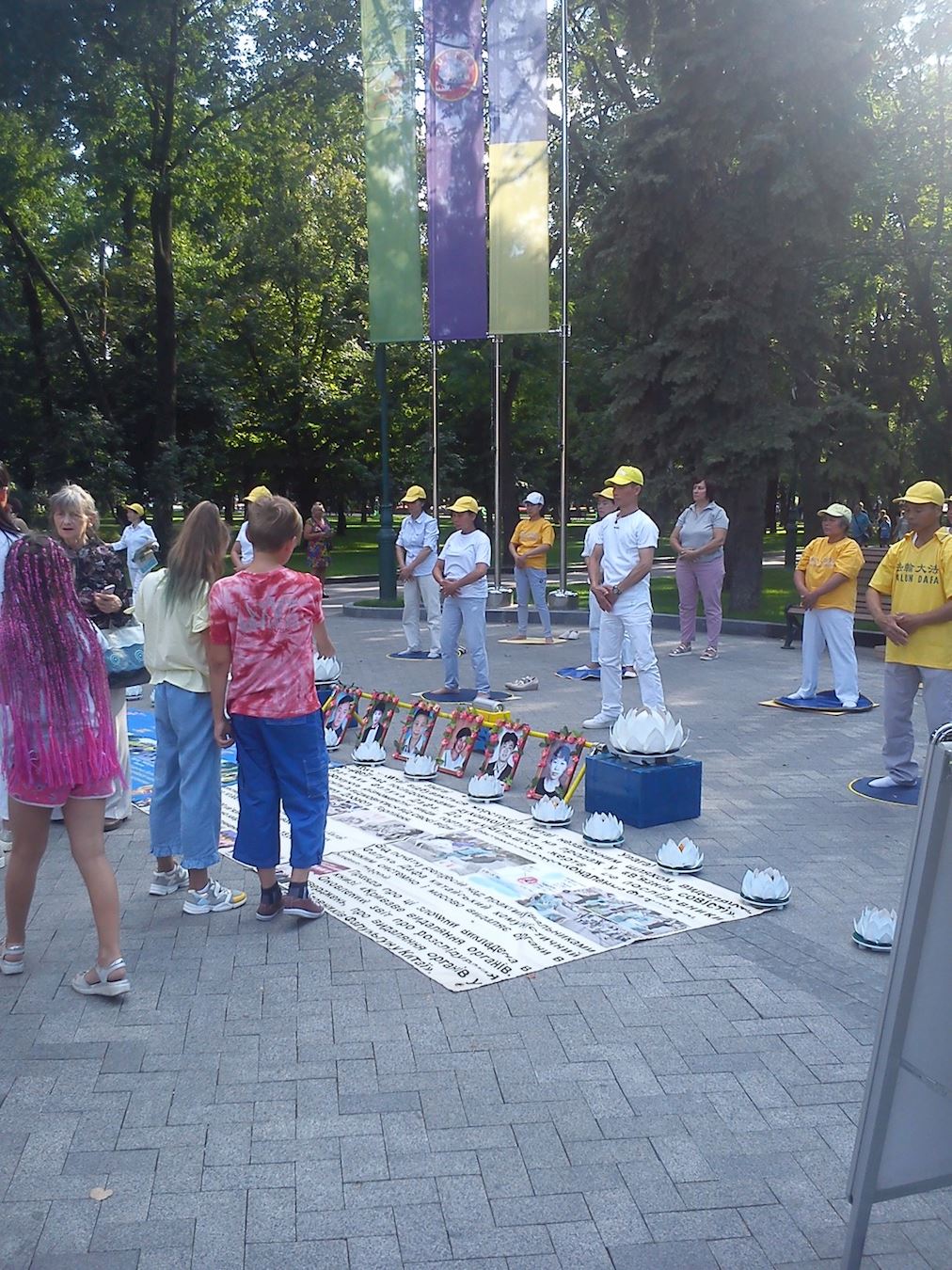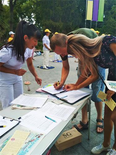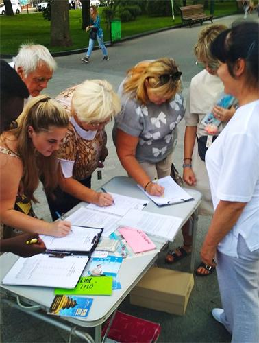 七月二十日,乌克兰第二大城市哈尔科夫市大法弟子在市中心公园举行反迫害活动。不少市民及游客明白真相后,签名反对中共迫害,声援法轮功。