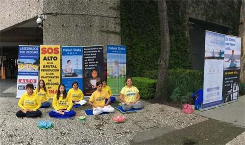 七月十九日,法轮功学员在墨西哥城中共领事馆外集会,炼功、讲真相。