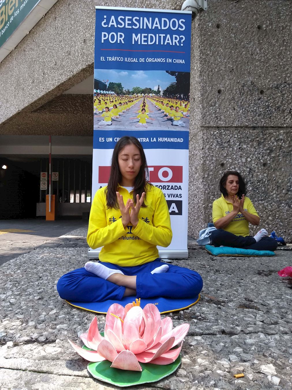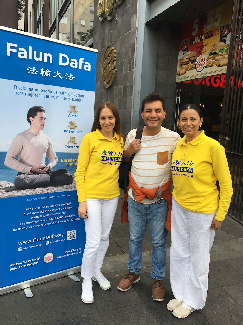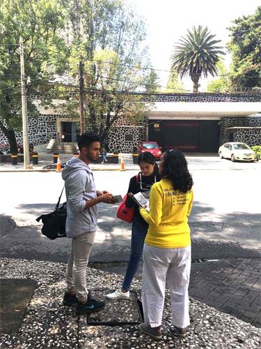 图1~4:法轮功学员在墨西哥城中共领事馆外炼功、讲真相