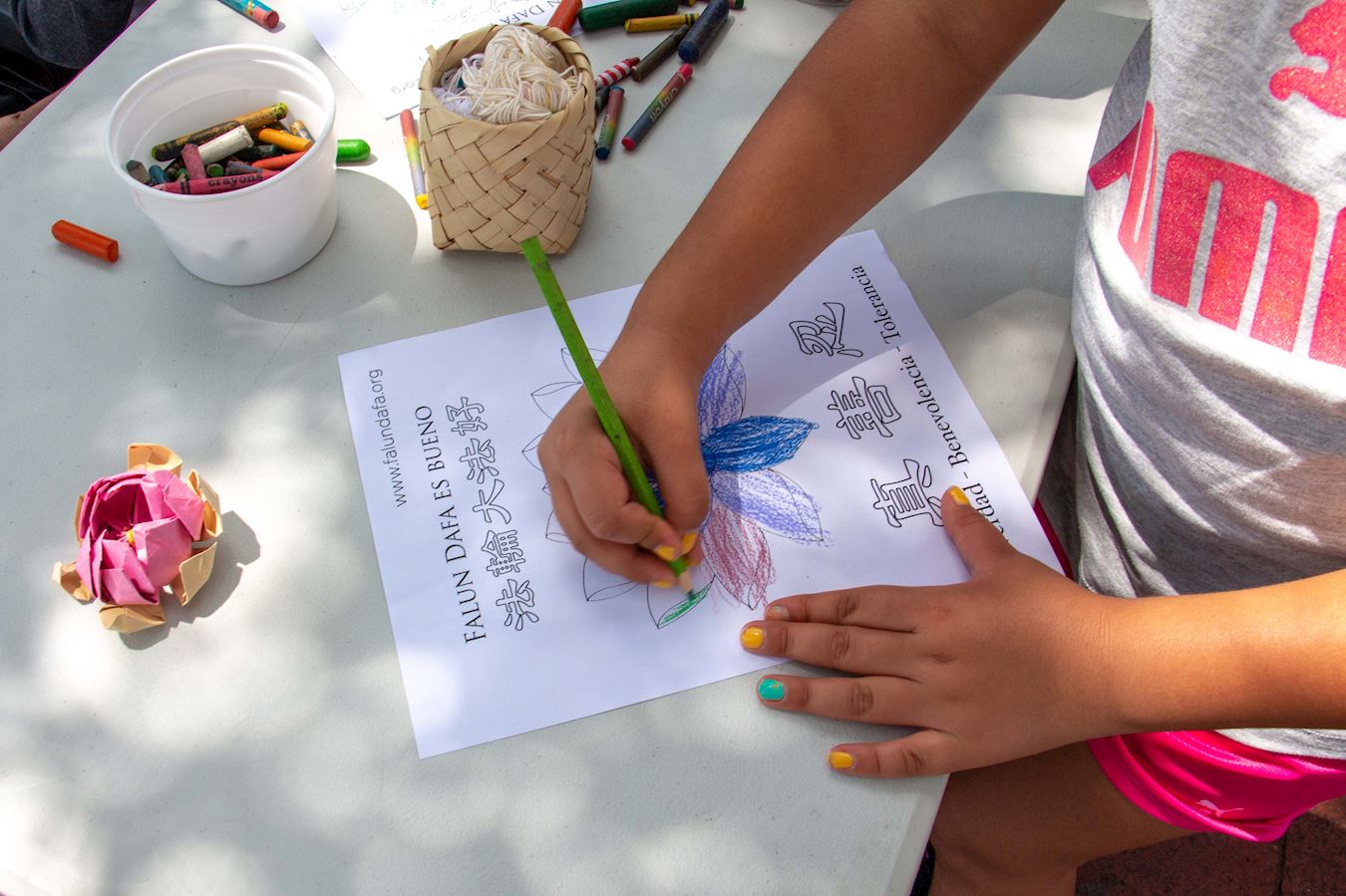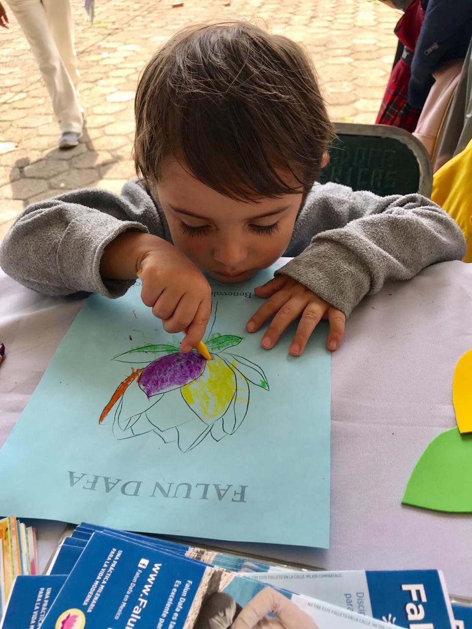 有两个小女孩向路人出售蛋白甜饼。一名学员向她们介绍大法,她们很快就迷上了学画莲花。