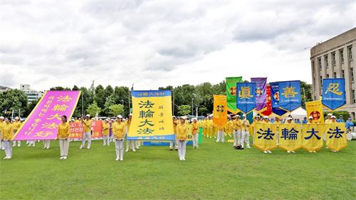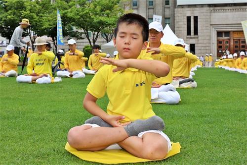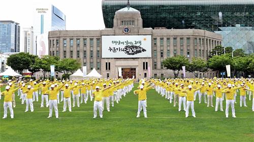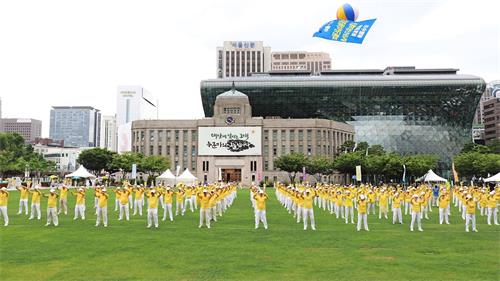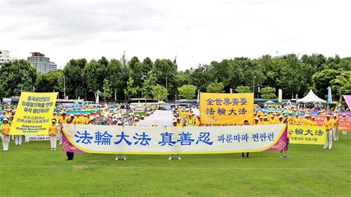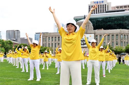 雨后,空气凉爽洁净。上午九点半,来自首尔、大田、光州、釜山、大邱、蔚山等全国各地的法轮功学员穿着印有“法轮大法好”的黄色上衣和白色裤子,伴随着优美平和的炼功音乐,在绿色草坪上炼五套功法,成为一道独特的风景线,吸引着过路市民们的目光,很多人驻足观看并用手机拍照下来。