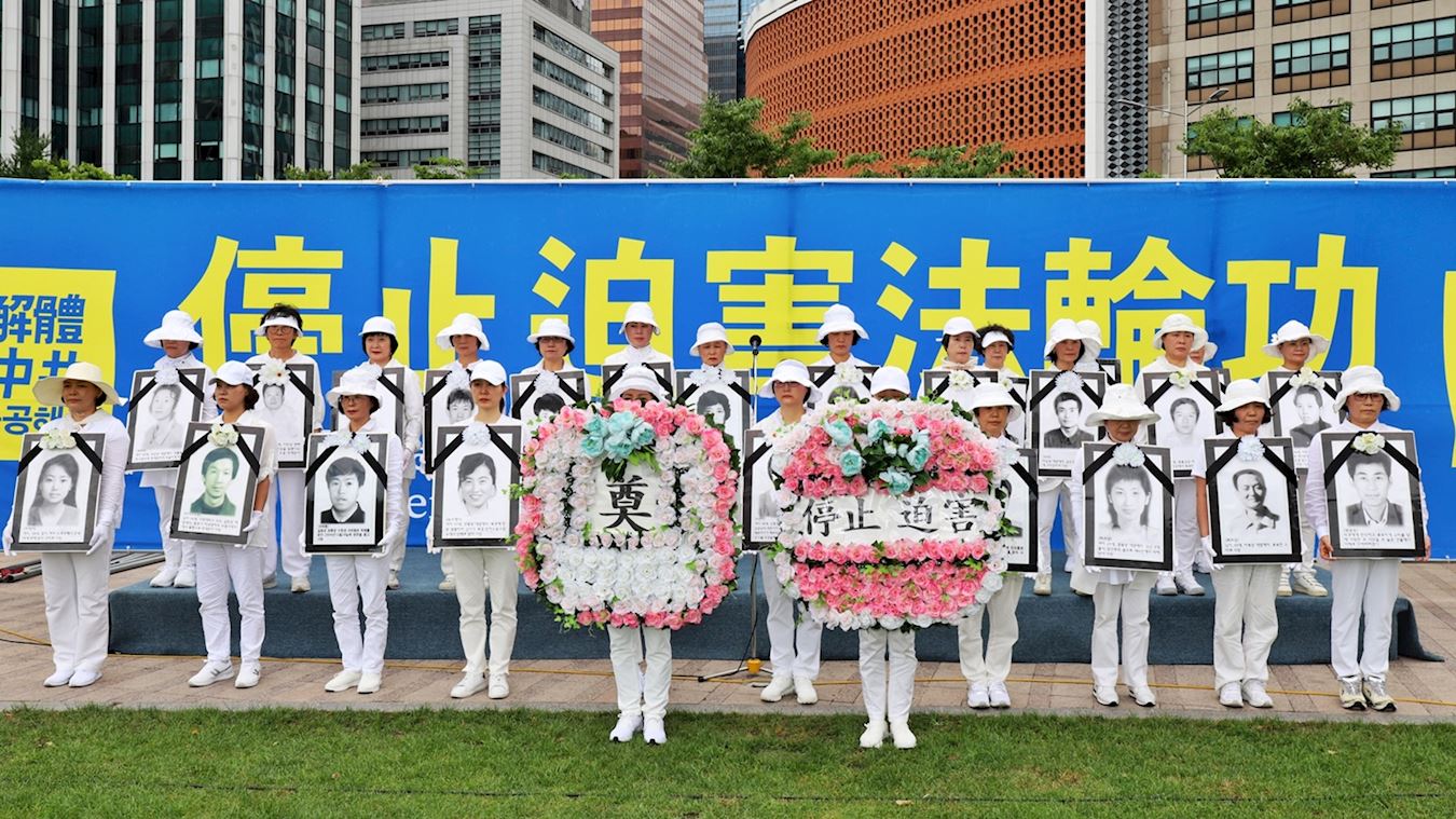 接下来进行集会,由法轮功学员组成的天国乐团演奏的追悼曲在首尔广场上空响起。二十多名身着白衣白帽的法轮功学员手捧因守护真理和信念遭迫害去世的学员遗像缓缓上台,伴随着《追悼词》的朗诵,与会者共同悼念这些牺牲者。