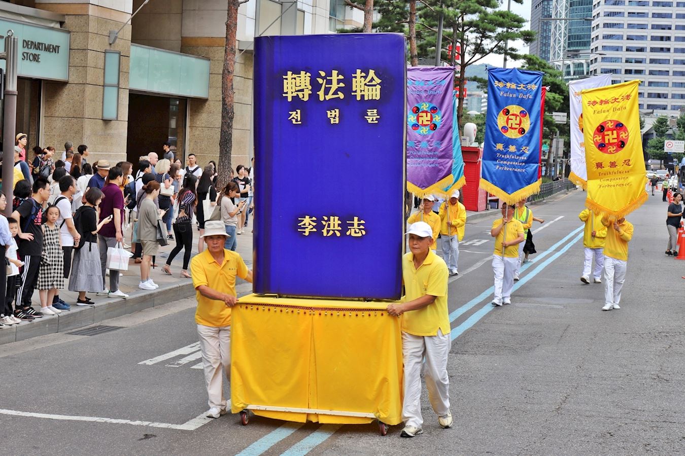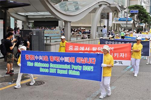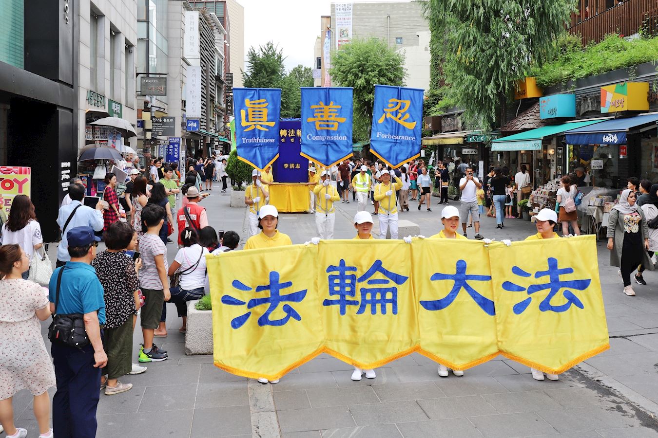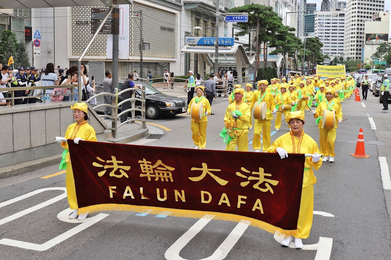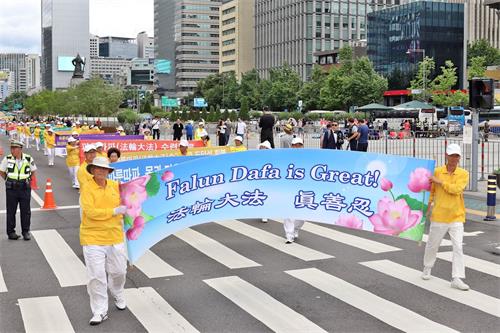 中午十二点,法轮功学员们开始了反迫害游行。队伍从首尔广场出发,分为“法轮大法的美好”、“真相与反迫害”、“声援三退”等多个方阵,途径光化门广场、仁寺洞、中国大使馆附近的明洞等韩国著名景点,总路程约四公里。