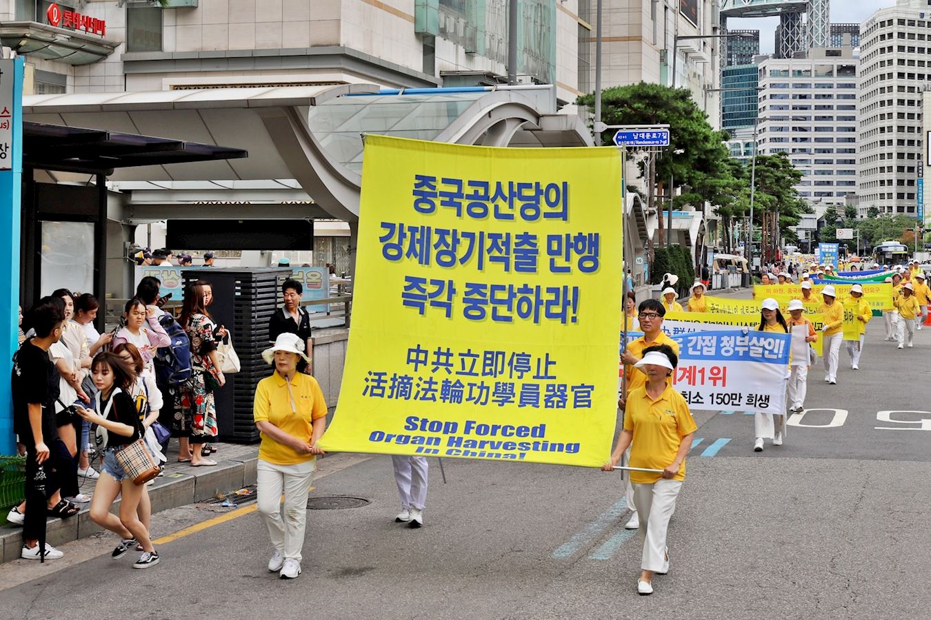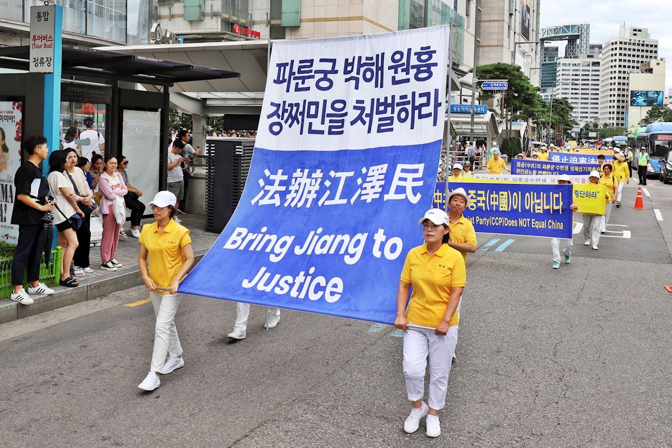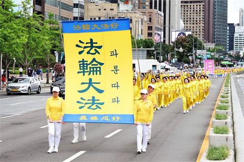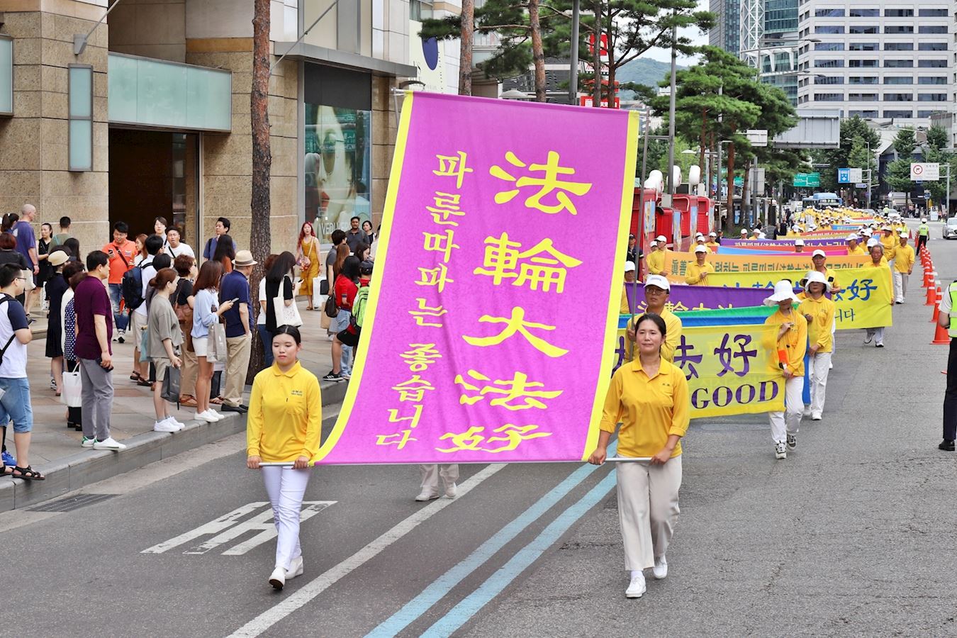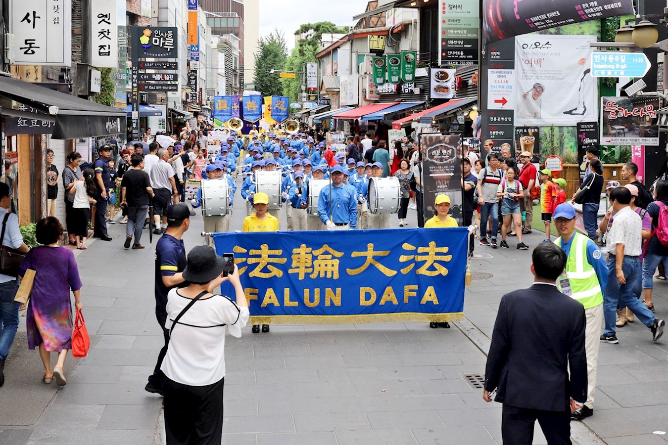 中午十二点,法轮功学员们开始了反迫害游行。队伍从首尔广场出发,分为“法轮大法的美好”、“真相与反迫害”、“声援三退”等多个方阵,途径光化门广场、仁寺洞、中国大使馆附近的明洞等韩国著名景点,总路程约四公里。